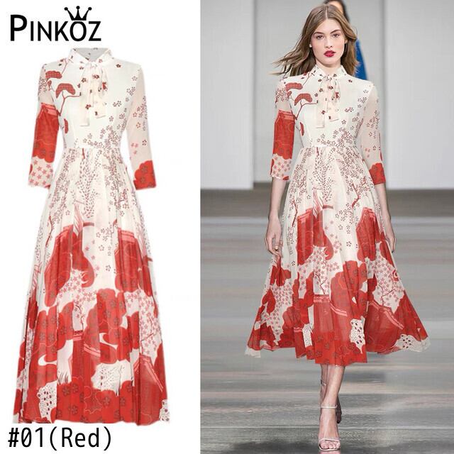 Pinkoz 滑走路パーティー ドレス女性フラワー プリント ルーズ ミディ ドレス弓襟スタイリッシュな Vestoidos ピンク リボン フラワーデザイン