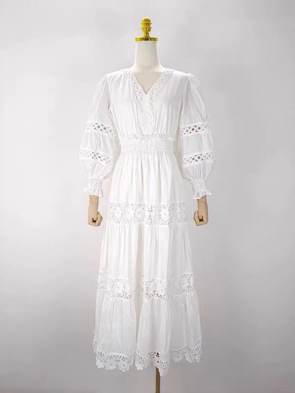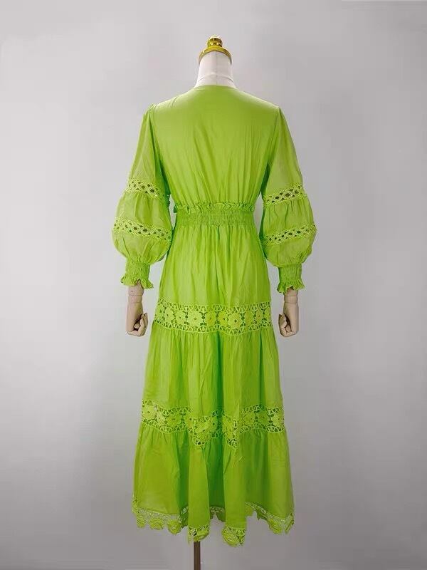 Pinkoz 女性レース中空アウト v ネックロングドレスランタンスリーブパーティーナイトファッションファム服 vestidos mujer z ピンク Vネック フェミニン