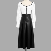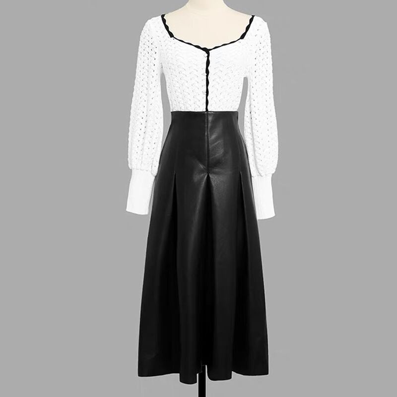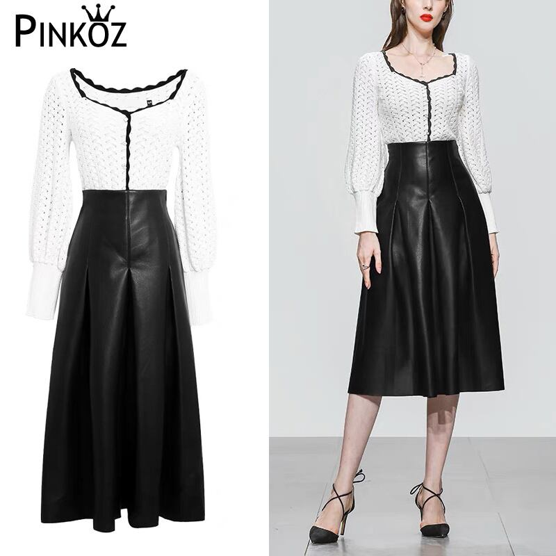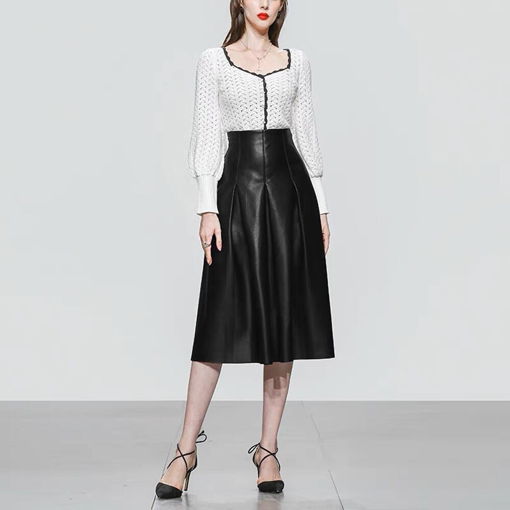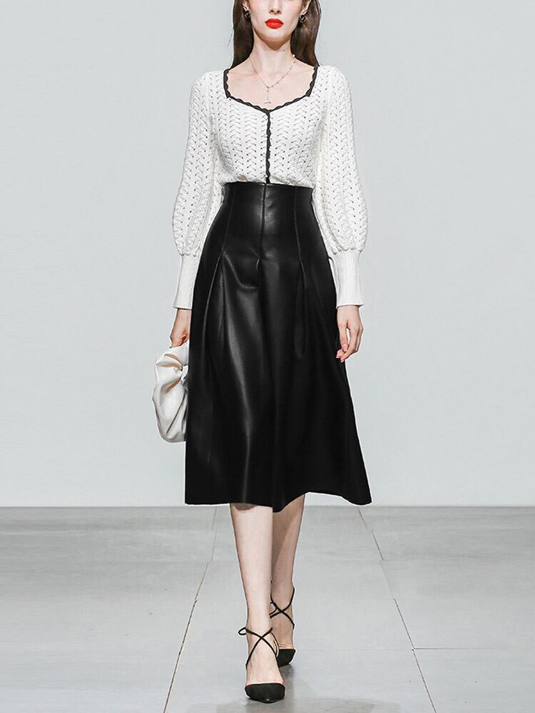 Pinkoz 2 点セット女性デザイナー エレガントな白いセーター ランタン スリーブ恋人ネック ホワイト トップス PU レザー スカート ヴィンテージ ピンク ランタンスリーブ 大人ガーリー スウィート キュート カジュアル ビンテージ