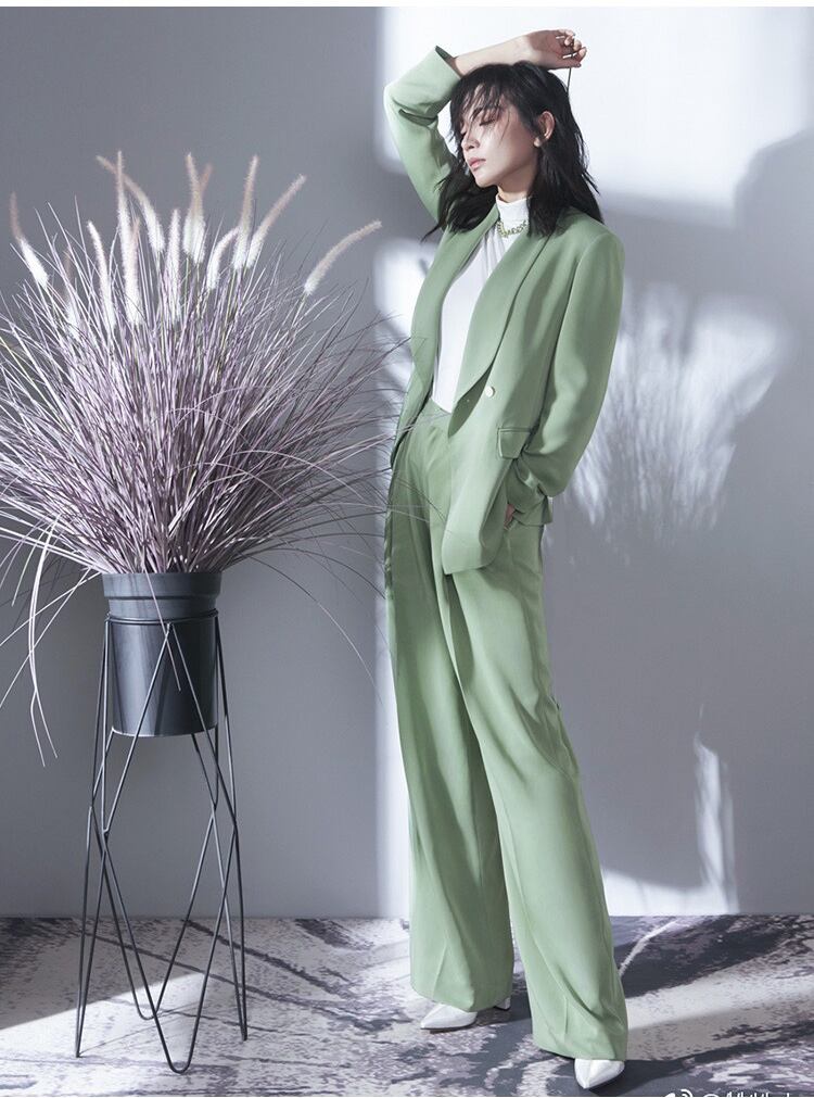 Pinkoz 女性エレガントなライトグリーンブレザーオフィスレディ作業服ロングパンツダブルブレスト 2 点セット女性スーツシック ピンク 会社 学校 通勤や通学にも