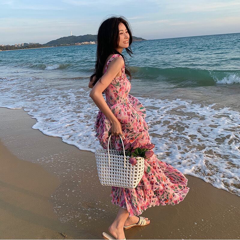 Pinkoz 滑走路デザイナー ピンクの花プリント弾性甘いミディ ドレスぬるぬるカスケード レイヤード キャミソール ドレス vestidos シック レッド エラスティック 伸縮 大人ガーリー スウィート キュート カジュアル フラワーデザイン
