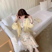 Pinkoz 女性ミディドレス妖精フローラルプリント v ネック春秋の休日のシックなドレスファッション自由奔放に生きるローブデ mujer vestidos traf ピンク スプリング 春物 オータム 秋物 花柄 Vネック