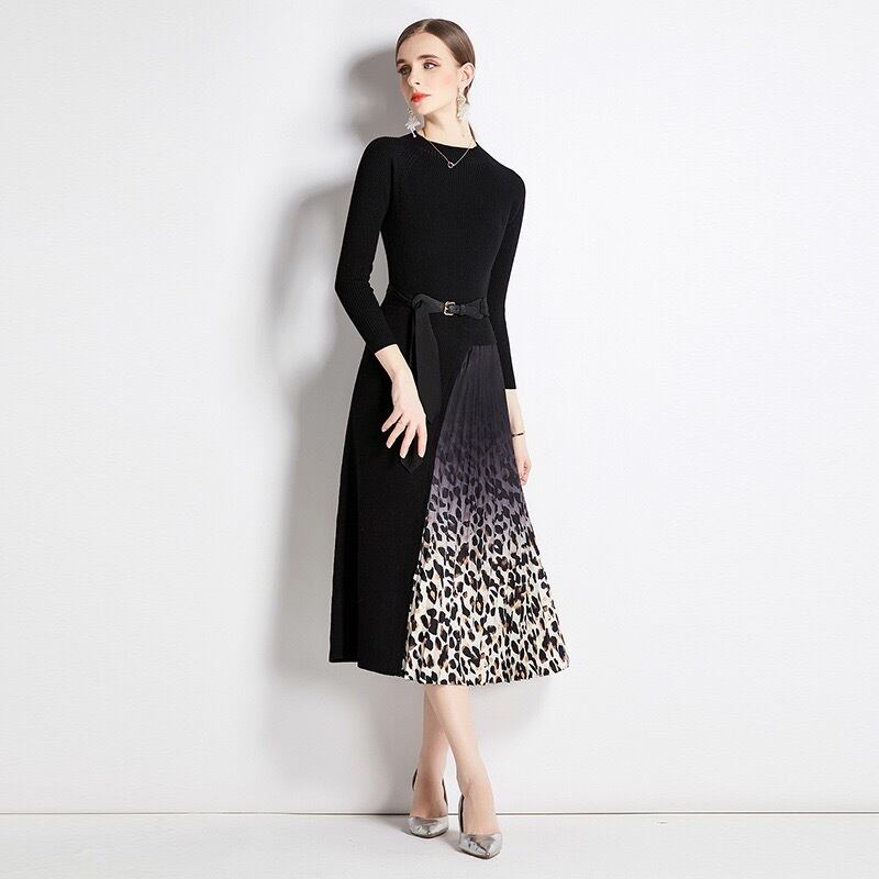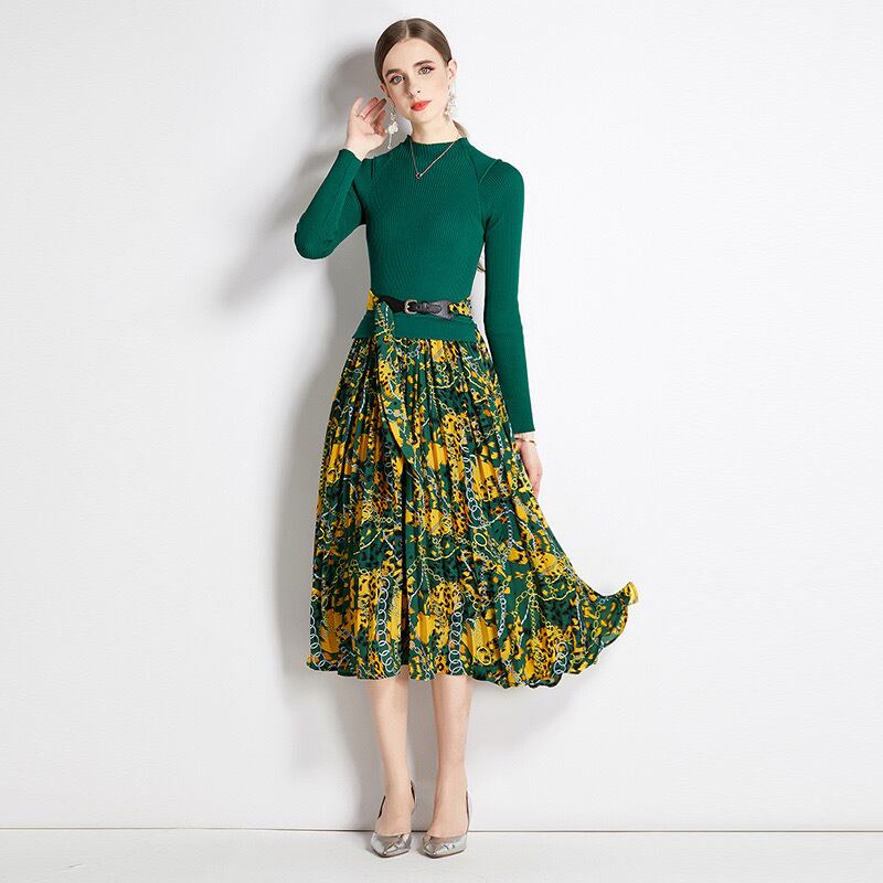 Pinkoz 滑走路デザイナー スタイル グリーン ニット ミディ花柄プリーツ ドレス女性スタンド カラー エレガント ベルト vestidos traf ピンク ハーネス