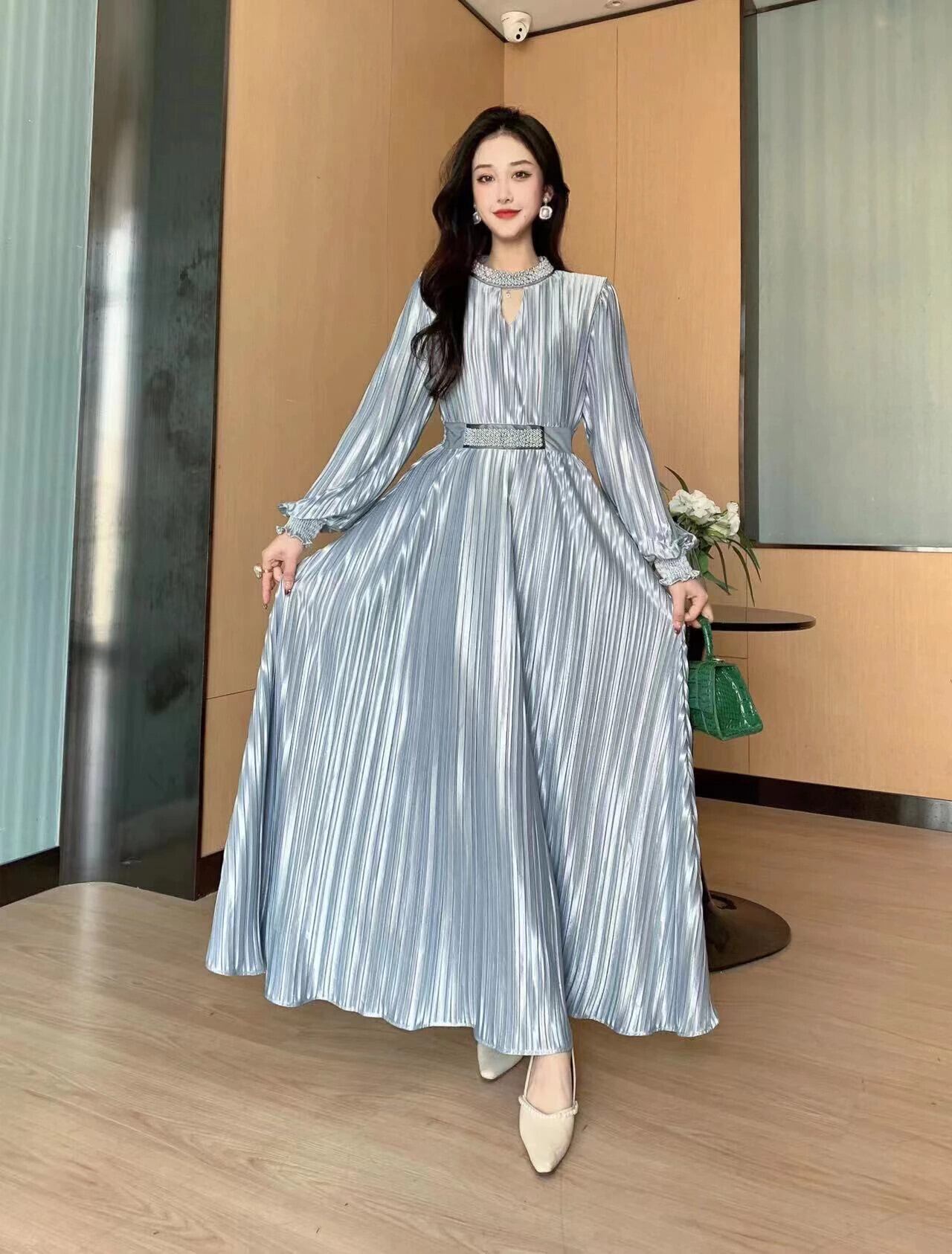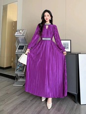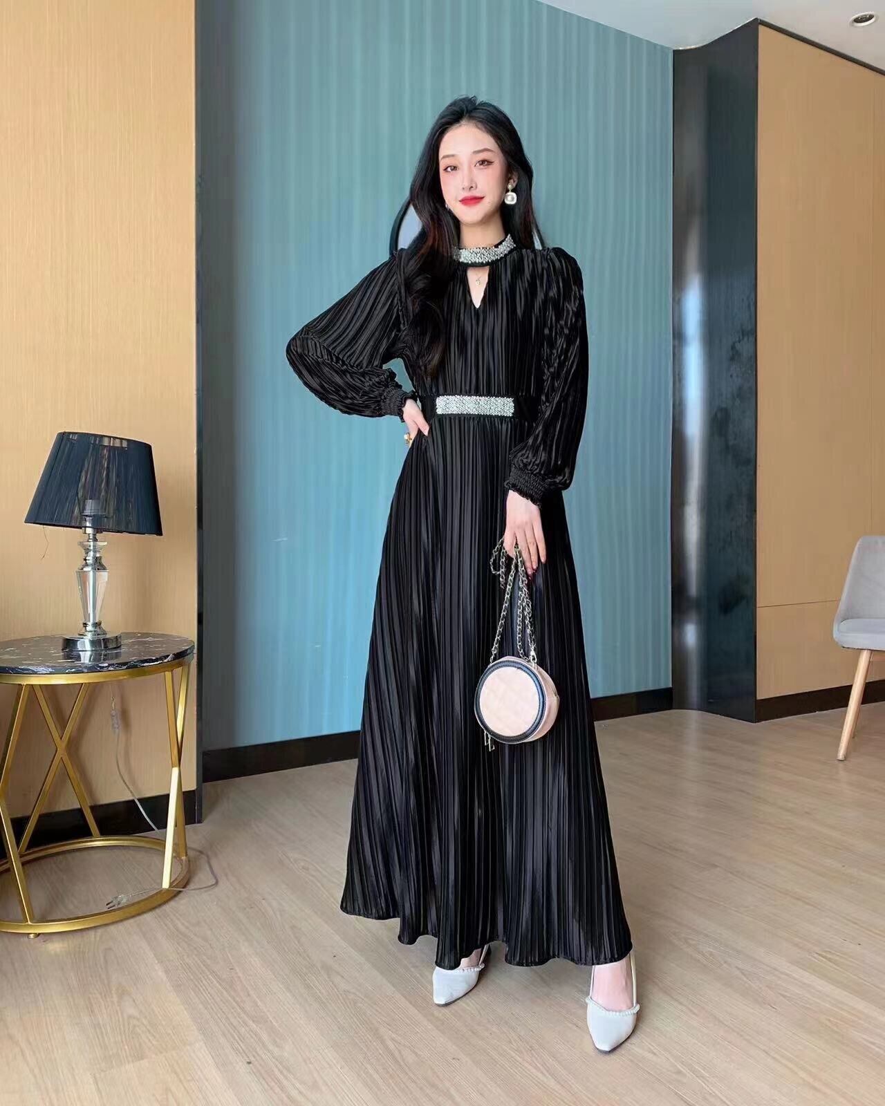Pinkoz 女性滑走路デザイナー ダイヤモンド ビーズ中空アウト ランタン スリーブ プリーツ マキシ ドレス パーティー ナイト ローブ デ mujer vestidos ピンク ランタンスリーブ