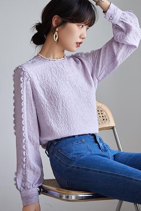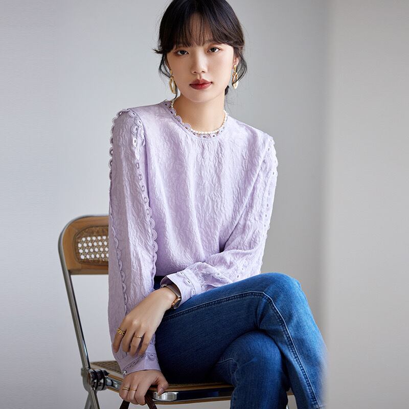 Pinkoz 女性デザイナー バイオレット ジャカード O ネック長袖ルーズ ブラウス パッチワーク レース中空アウト オフィス レディー トップス za ロング ピンク Oネック 会社 学校 通勤や通学にも