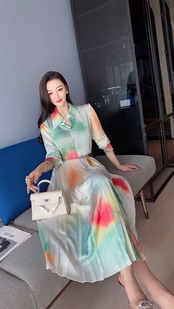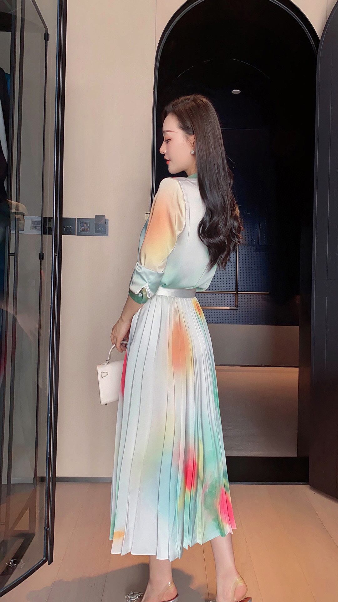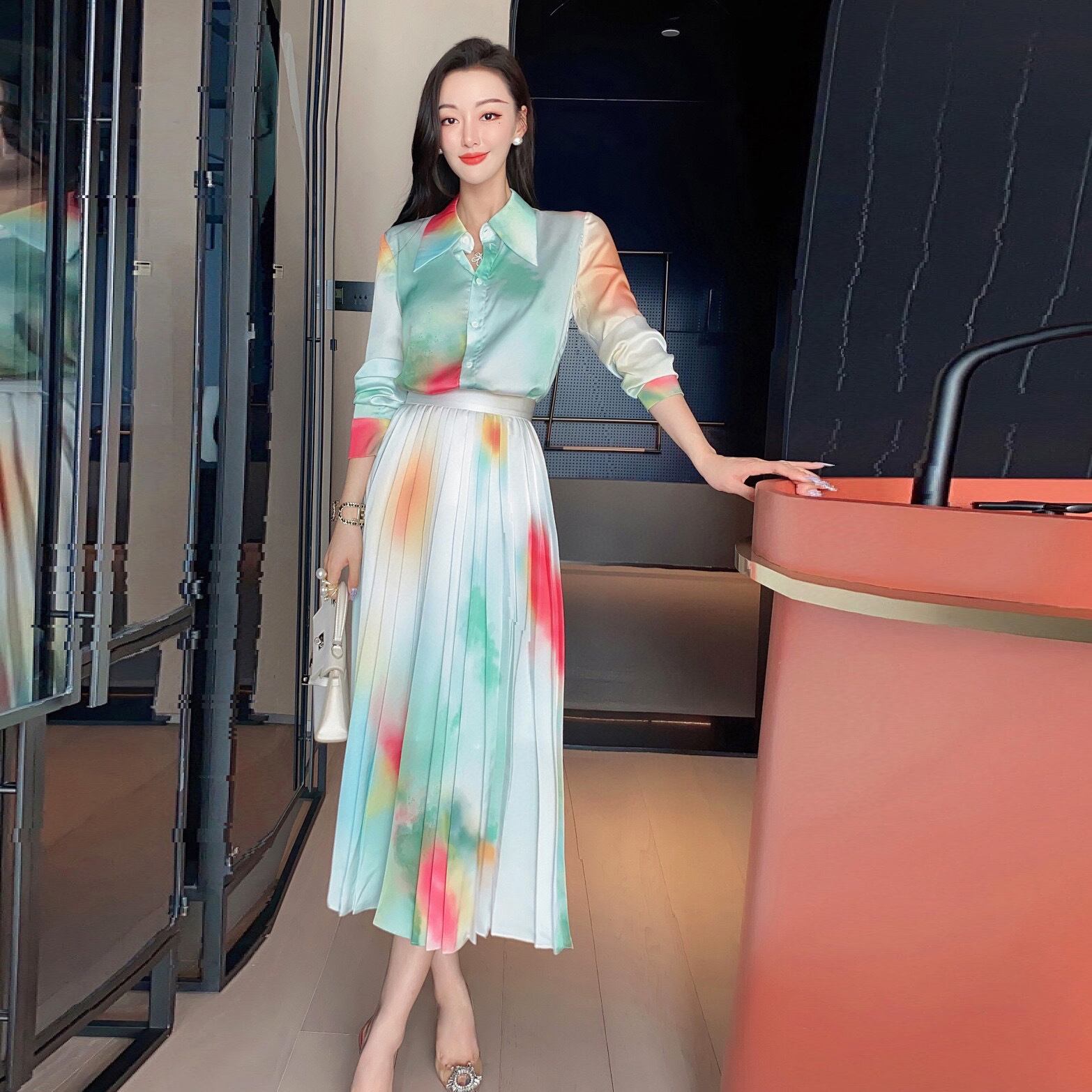 Pinkoz 女性 2 点セット グリーン プリント ターン ダウン襟長袖エレガントなシャツ ブラウス トップス + ミディ プリーツ ミディ スカート スーツ ロング ピンク