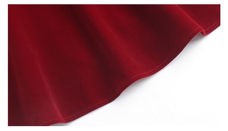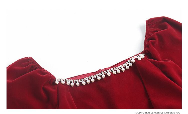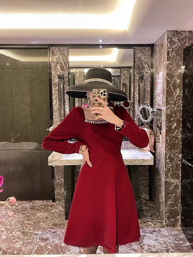 Pinkoz 女性クリスタル パール ビーズ スクエア カラー ベルベット赤 a ライン秋冬ドレス エレガント シックな パーティー ドレス高待機ローブ ピンク レッド オータム 秋物 ウィンター 冬物 Aライン 真珠 スクウェア