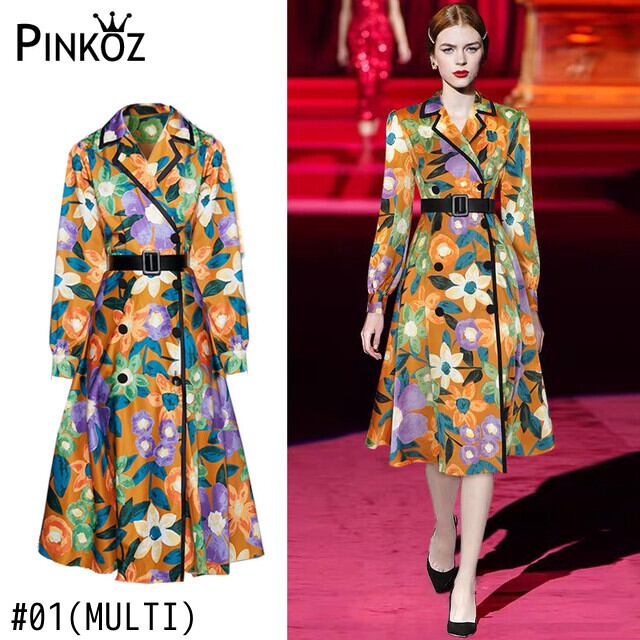 Pinkoz 女性デザイナースタイリッシュでエレガントな花柄プリントノッチフルスリーブ冬秋ボタン自由奔放に生きるミディドレス大サイズベルト ピンク 大きめサイズ オータム 秋物 ウィンター 冬物 ハーネス