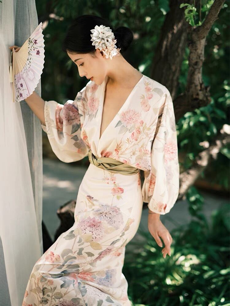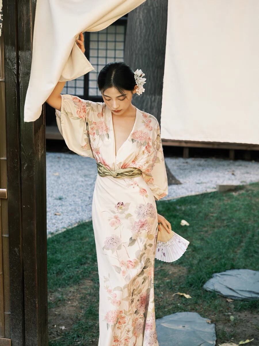 Pinkoz デザイナー女性マキシドレス花柄プリント v ネック着物スタイリッシュなバットウィングスリーブ夏ぬるぬるドレスパーティーナイトファッション ピンク サマー 夏物 Vネック