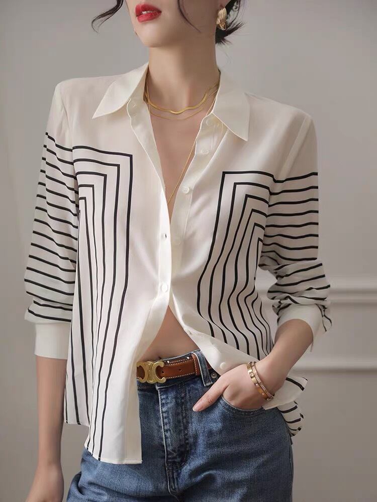 Pinkoz 女性エレガントな黒と白のストライプのルーズシャツシングルブレストターンダウン襟オフィスレディファム roupas femininas y2k ピンク ホワイト ブラック フェミニン 会社 学校 通勤や通学にも