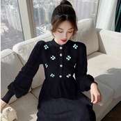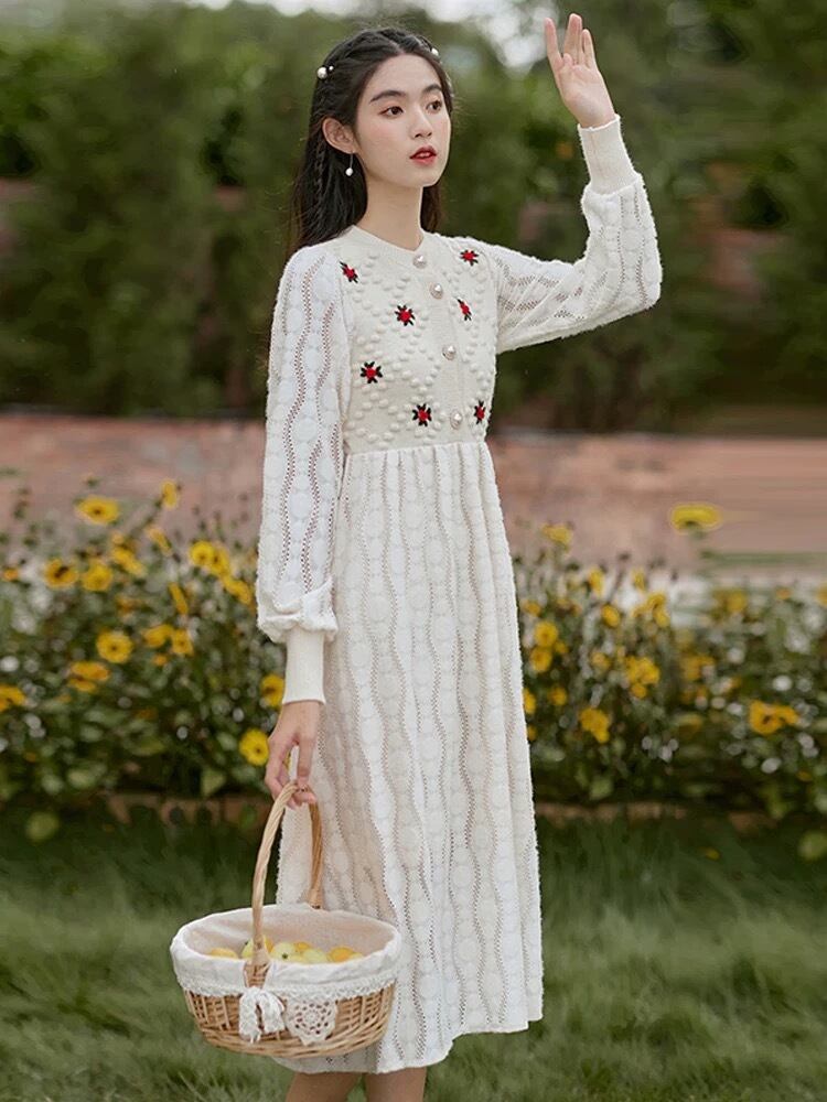 Pinkoz ベージュ 花柄 刺繍 ボタン 秋冬 ミディワンピース 編み物 カジュアル Aライン お嬢様 ヴィンテージ ベスト トラフザ ピンク オータム 秋物 ウィンター 冬物 ドレス ビンテージ