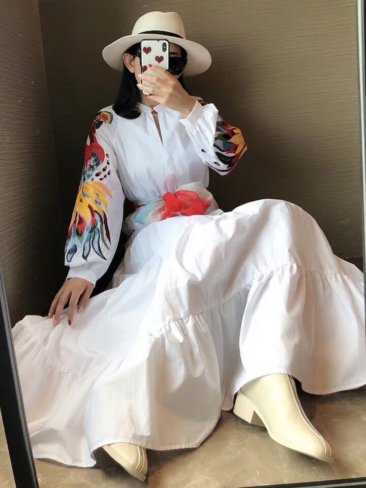 Pinkoz エレガントな動物刺繍パッチワーク女性ドレスランタンスリーブハイウエストサッシ付きロングドレス女性マキシ自由奔放に生きるドレス ハイウェスト ピンク