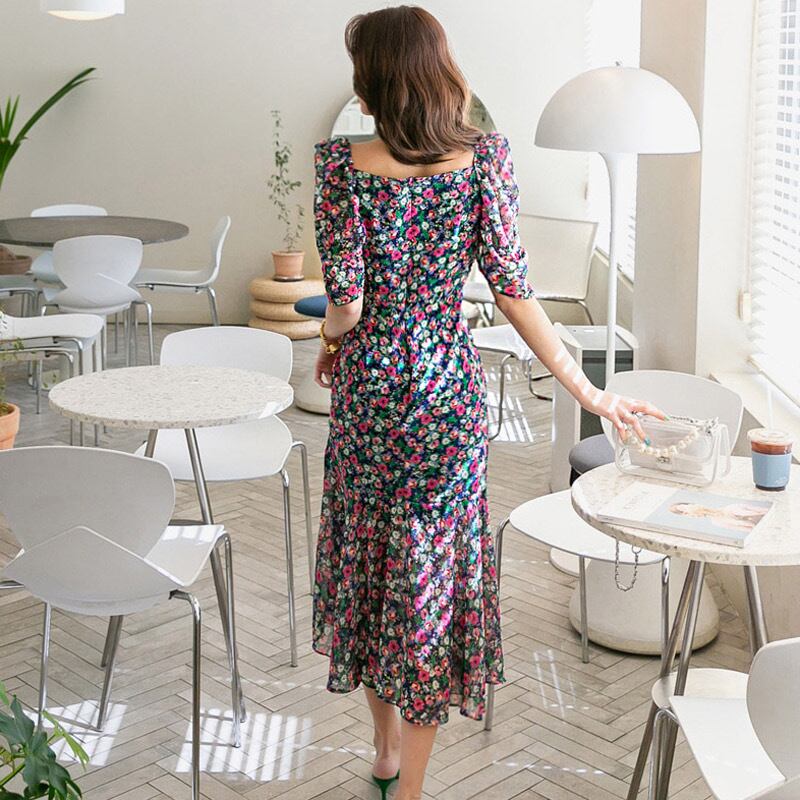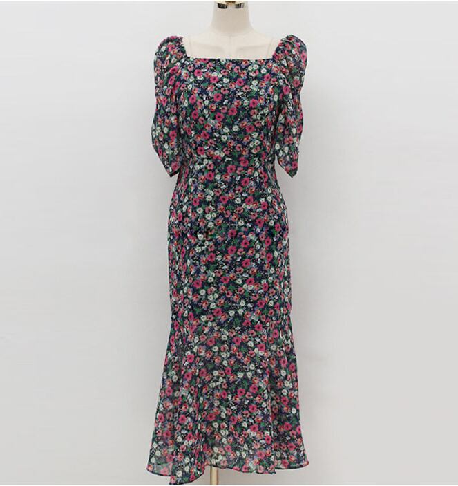 Pinkoz 夏の女性のスクエアネック半袖スリム A ライン花柄プリントドレス服パーティー Vestidos ショート ピンク ハーフスリーブ サマー 夏物 Aライン スクウェア