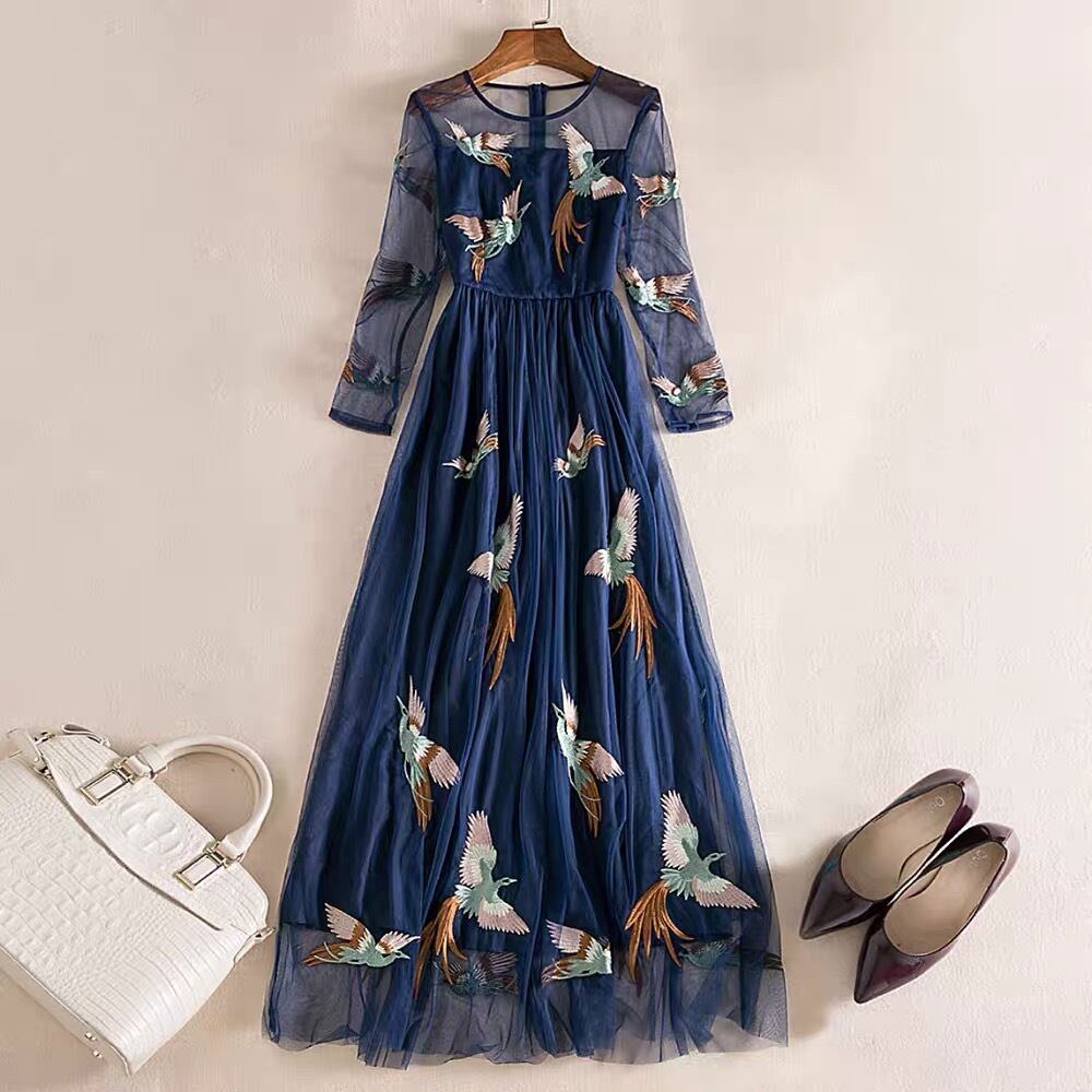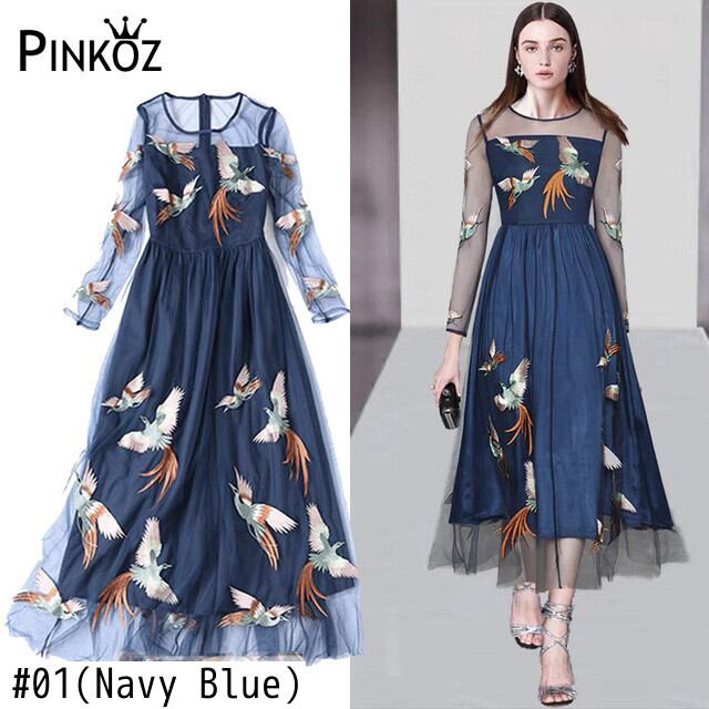 Pinkoz 女性ヴィンテージミディドレスメッシュネイビーブルー動物鳥 embroideried パーティードレスローブファム vestidos traf 新しい ピンク 刺繍 フェミニン ビンテージ