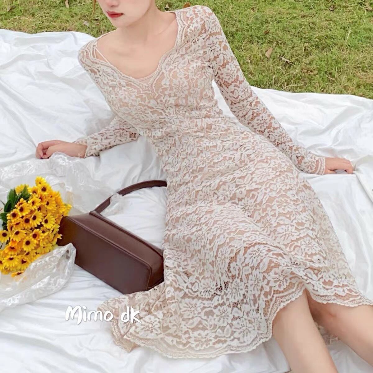 Pinkoz ベージュ レース v ネック春ミディ ドレスぬるぬるフル スリーブ エレガントな A ラインの女性ドレス カジュアル ハイストリート OL ローブ vestidos ピンク スプリング 春物 Vネック Aライン