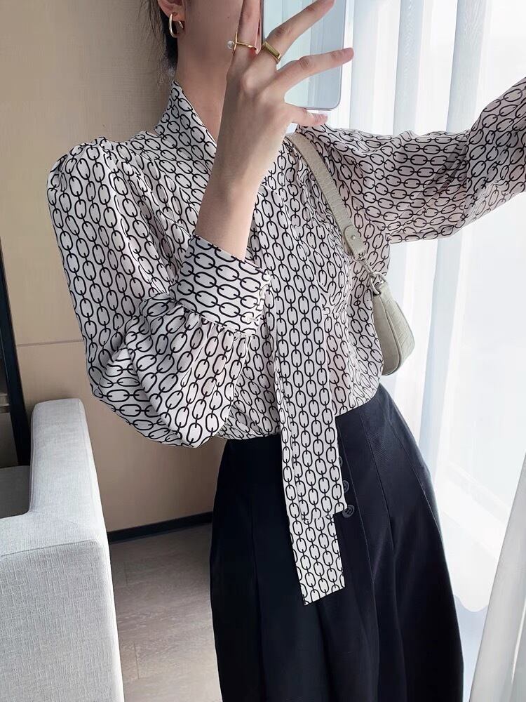 Pinkoz オフィス レディー チェーン プリント ボウ カラー デザイナー シフォン ブラウス女性トップス春秋のファッション トップス ファム blusas y camisas ピンク リボン スプリング 春物 オータム 秋物 フェミニン 会社 学校 通勤や通学にも
