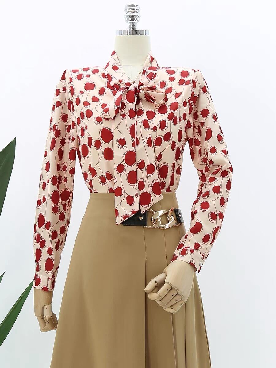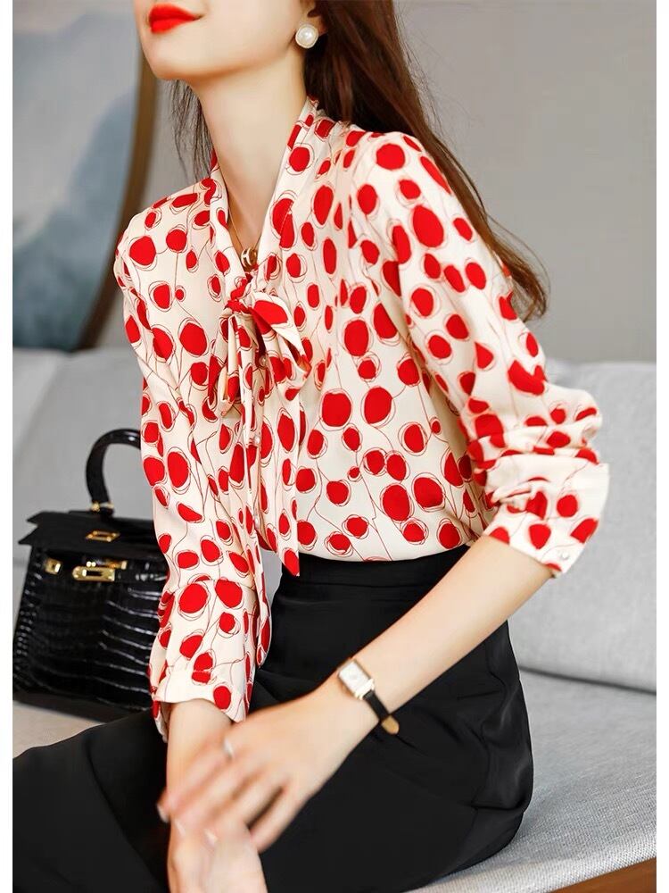 Pinkoz 赤水玉ボウカラー女性ブラウスファッションフルスリーブシフォンカジュアルシャツファムレースアップファムトップス新プラスサイズ 2xl ピンク レッド リボン 大きめサイズ フェミニン