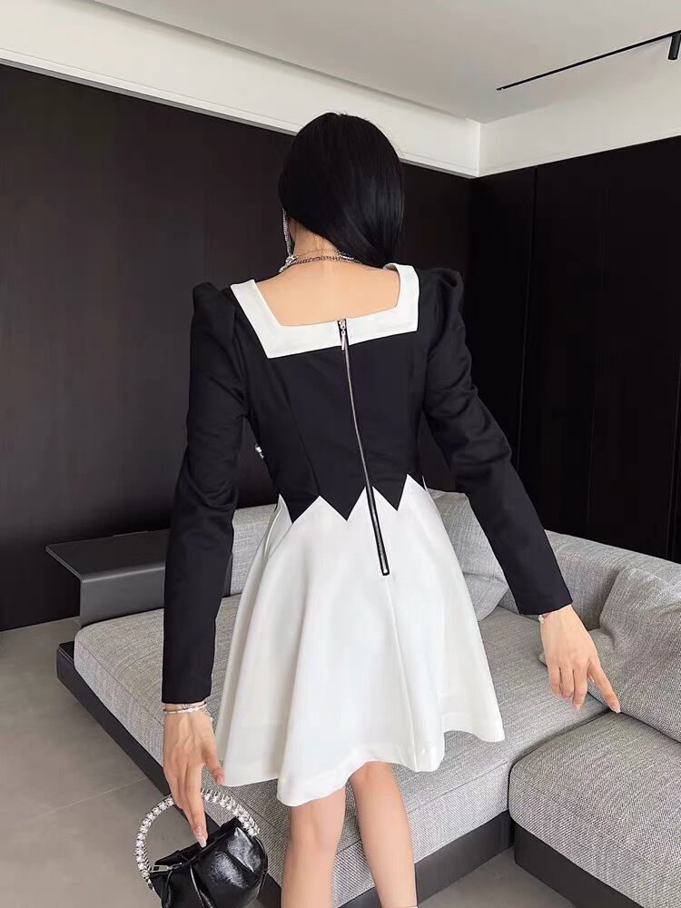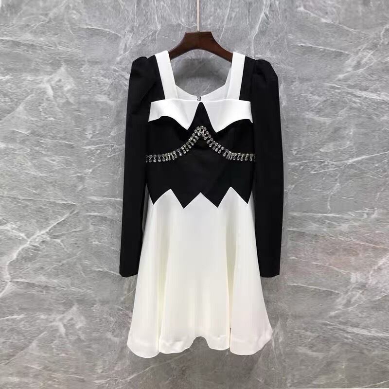 Pinkoz ヴィンテージ vestidos 黒パッチワーク ホワイト a ライン ミニ ドレス スクエア カラー春秋エレガントなクリスタル ビーズ服 ピンク ブラック スプリング 春物 オータム 秋物 Aライン スクウェア ビンテージ