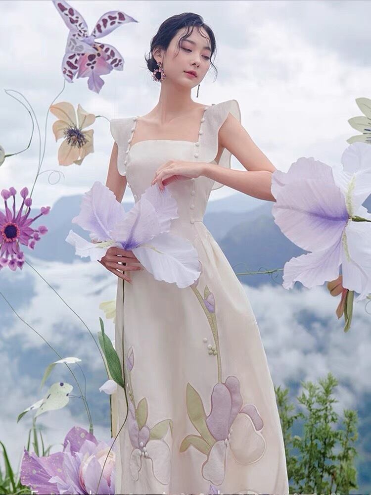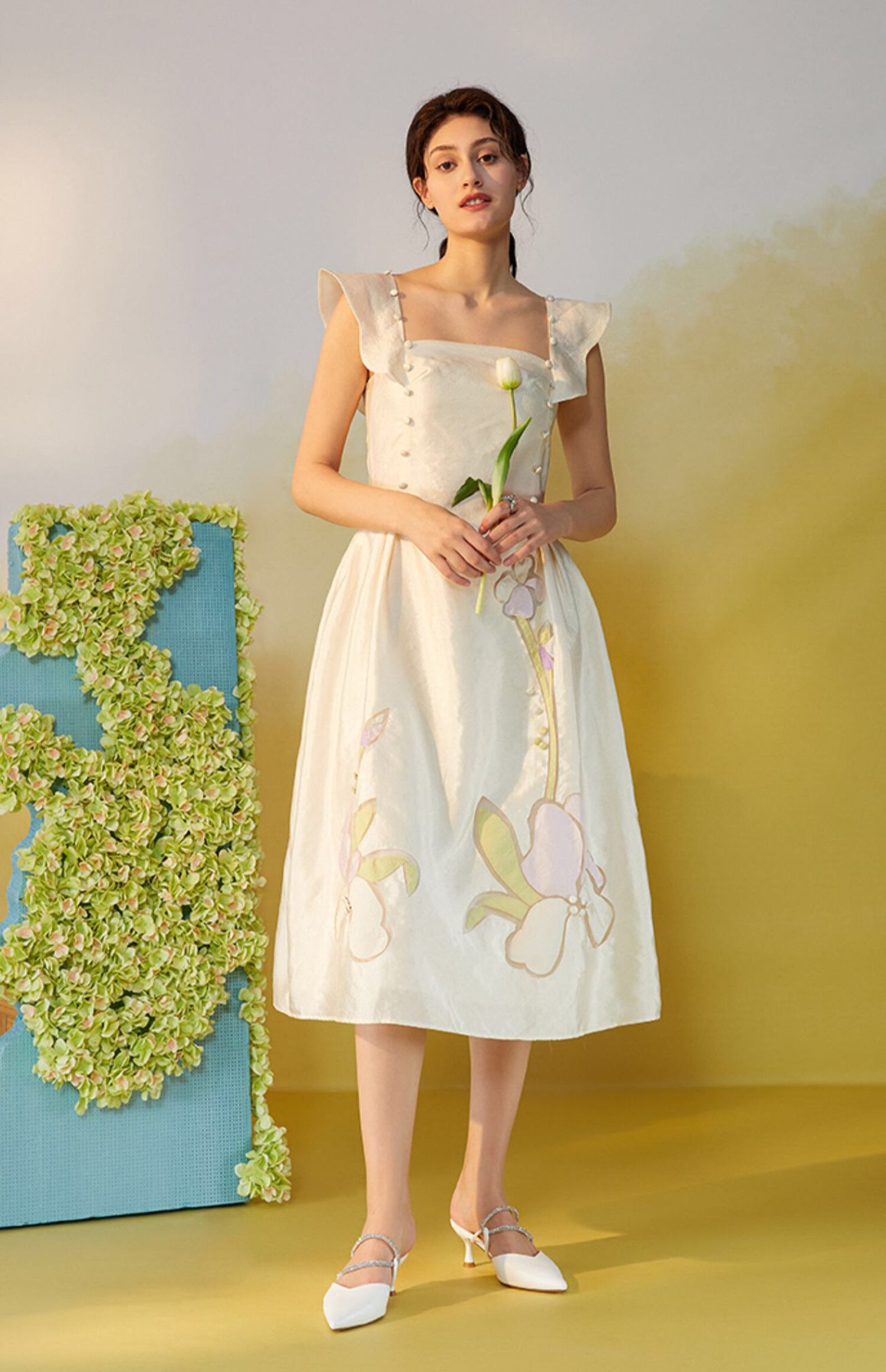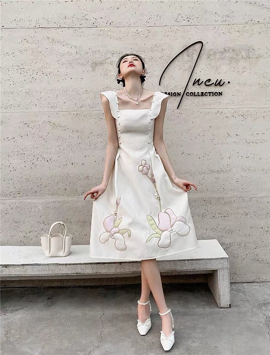 Pinkoz デザイナー スタイリッシュなベージュ エレガントな妖精ミディ ドレス ボタン ジャカード スパゲッティ ストラップ ぬるぬる ハイ ウエスト ドレス パーティー服 ハイウェスト ピンク