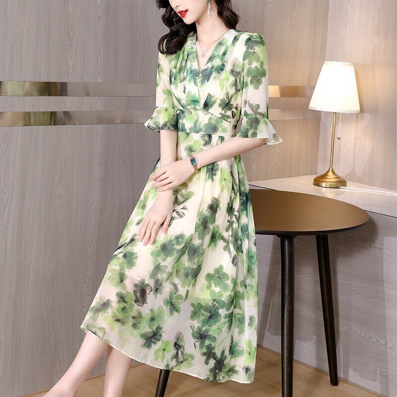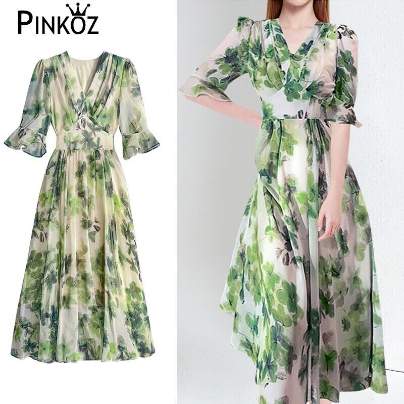 Pinkoz 女性グリーンフローラルプリントミディドレス夏シフォンファッション服ローブビッグサイズ vestidos デ mujer カジュアルエレガンテ nrw ピンク エレガント サマー 夏物 花柄