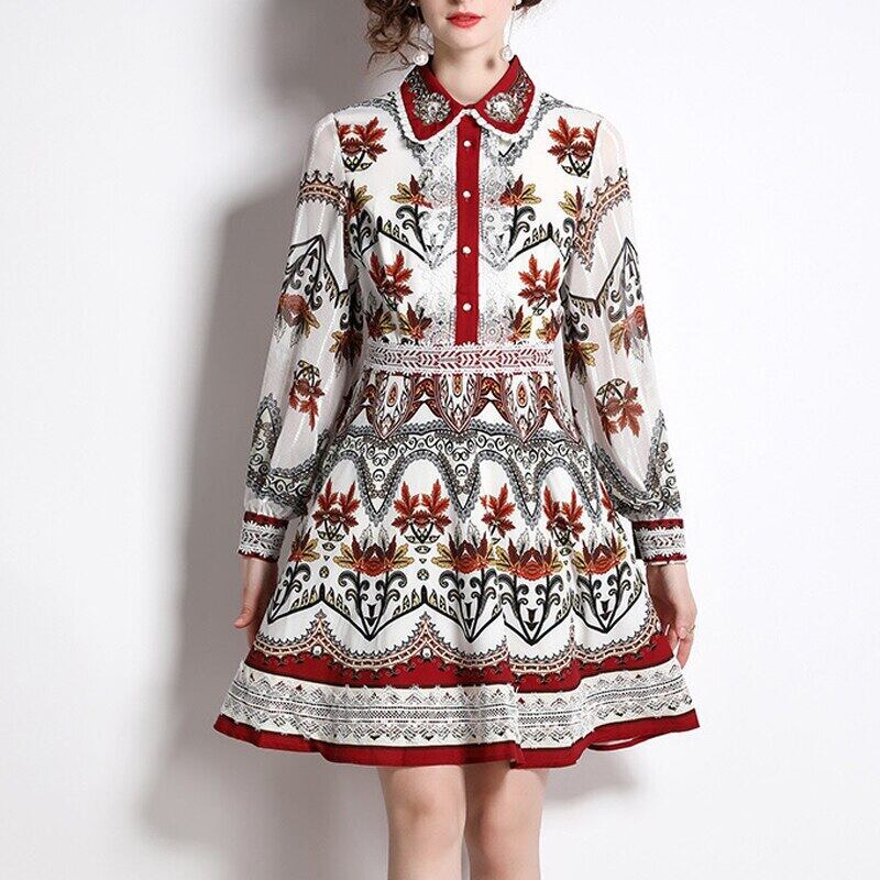 Pinkoz 女性デザイナーフラワープリントパッチワークレースシングルブレストミニドレスパーティーフルスリーブ秋冬ドレス vestidos ピンク オータム 秋物 ウィンター 冬物 フラワーデザイン