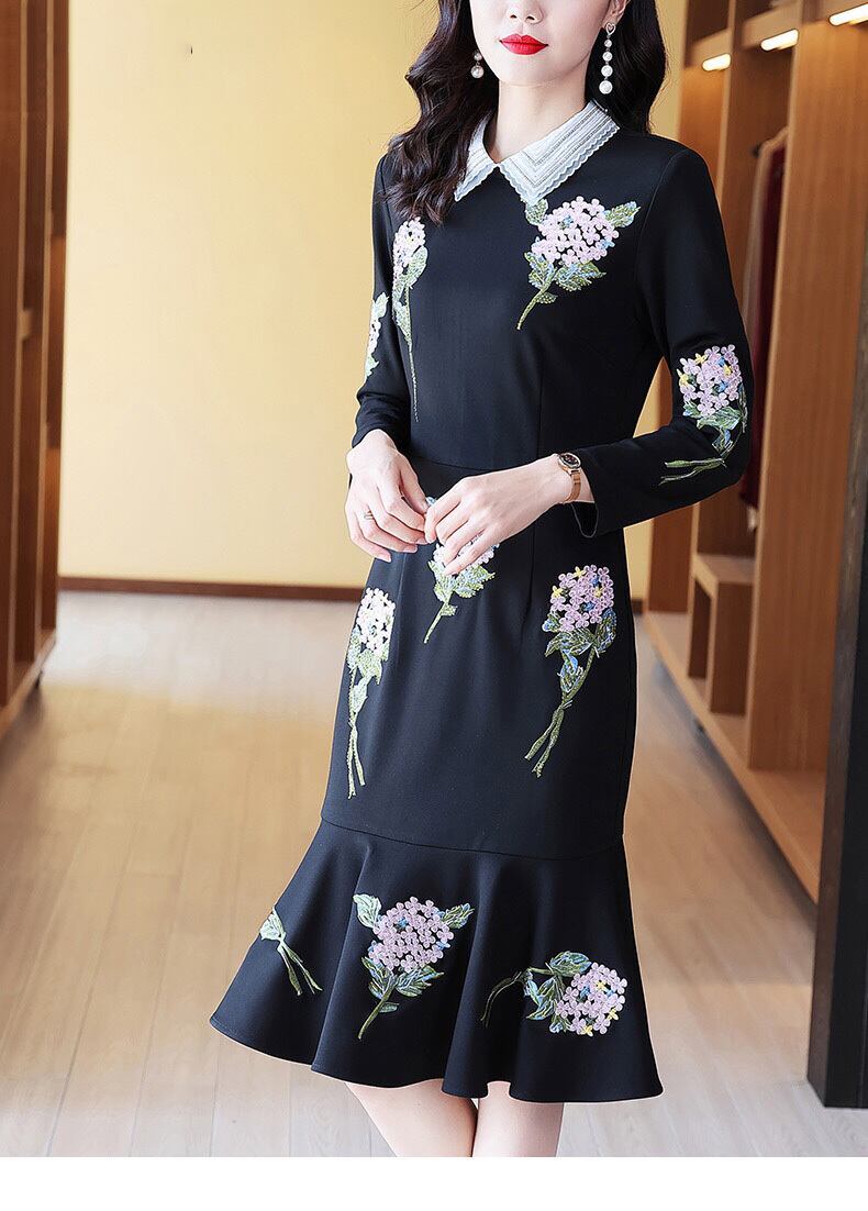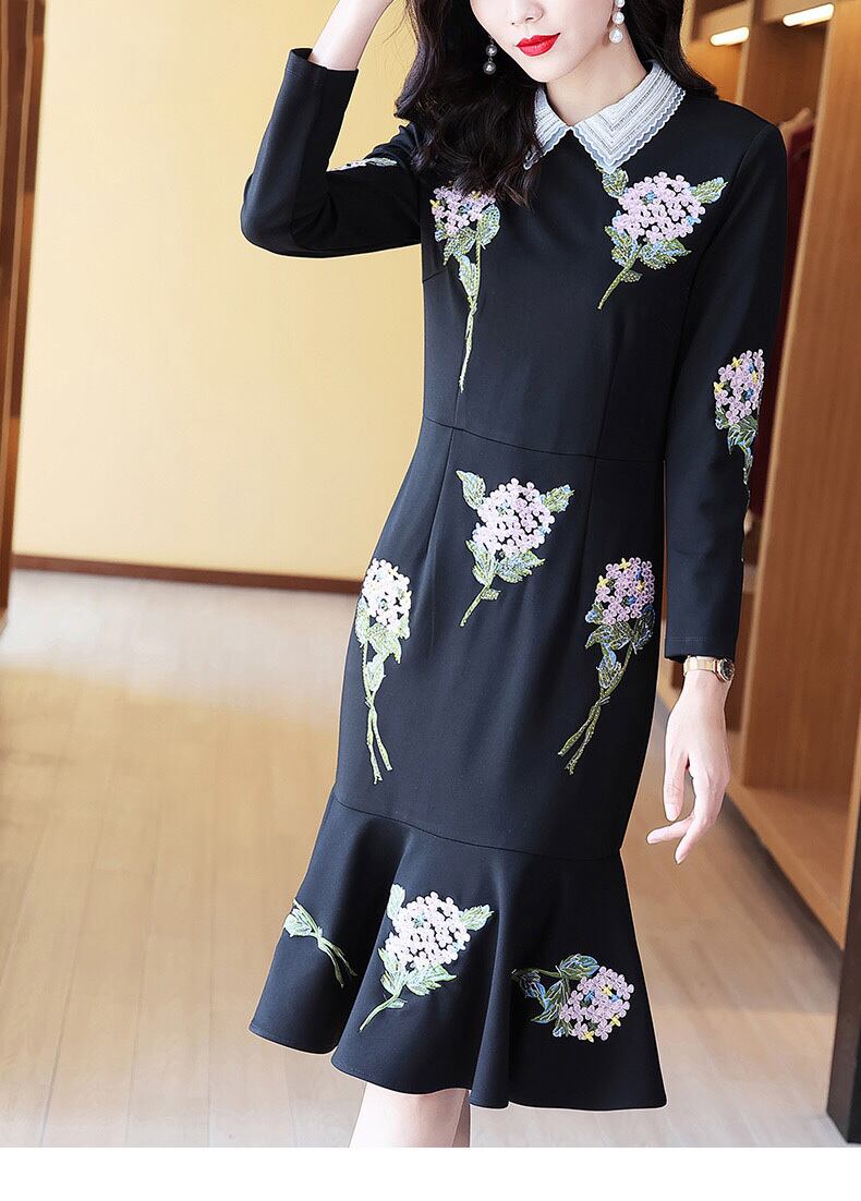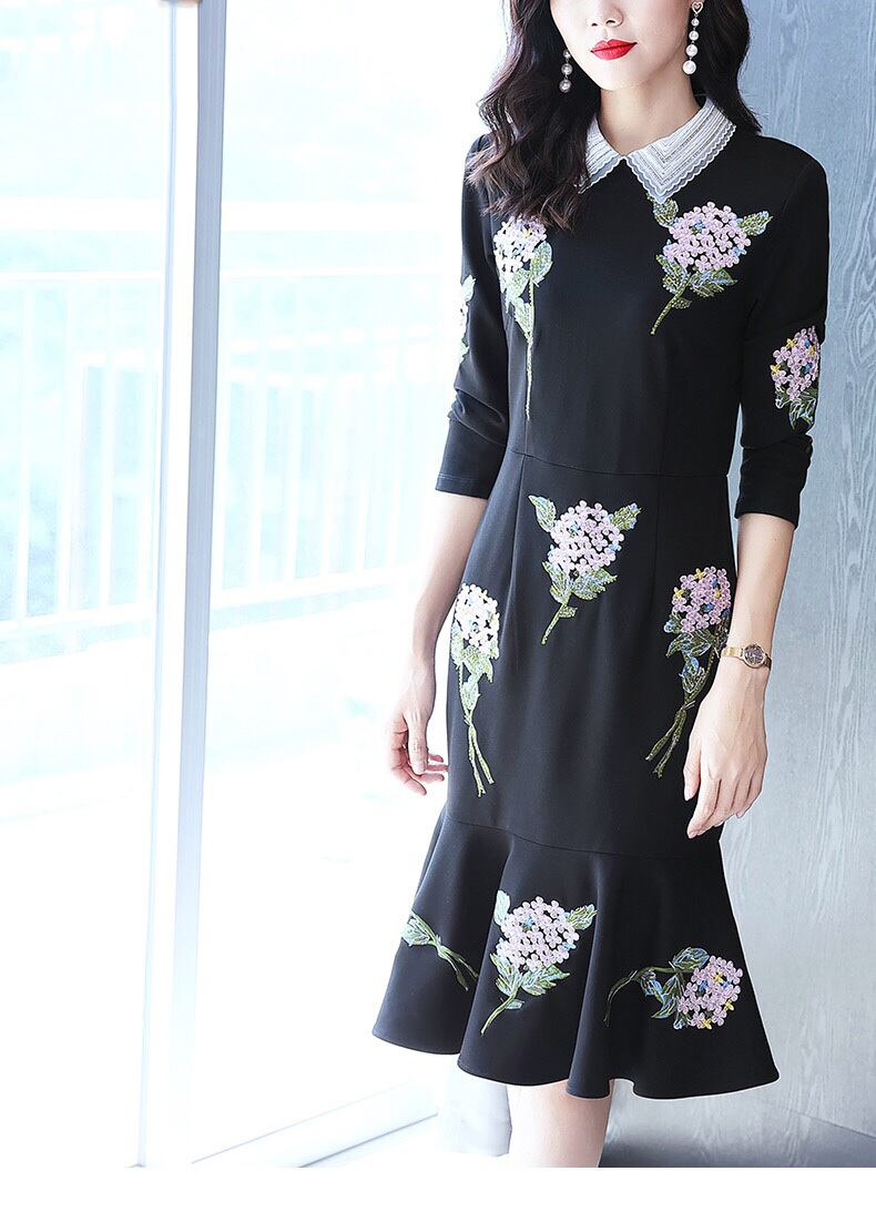Pinkoz 滑走路デザイナースタイリッシュな黒アジサイの花 embroideried ピーターパンマーメイドミディドレス女性エレガントな vestidos 新 ピンク ブラック 刺繍 フラワーデザイン