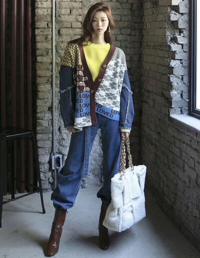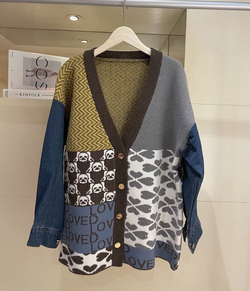 Pinkoz 滑走路デザイナー女性カーディガン ファム パッチワーク デニム ニット ルーズ ジャケット手紙チェック柄ストリート ファッション服 taf ピンク フェミニン