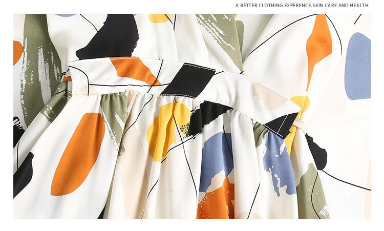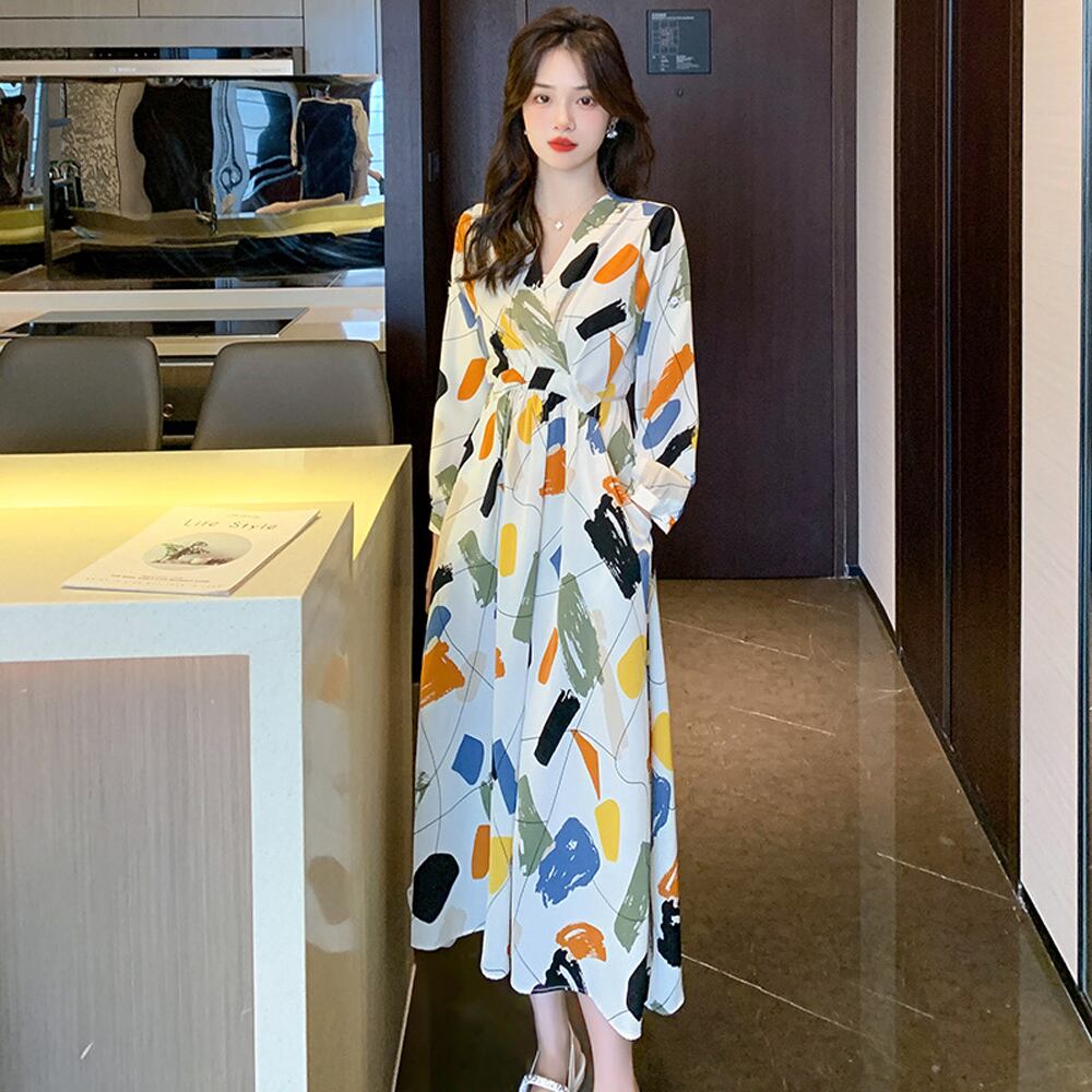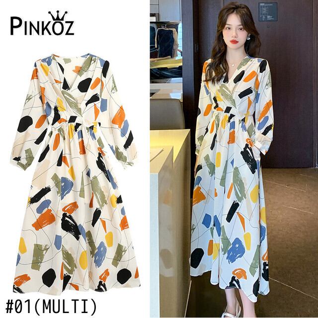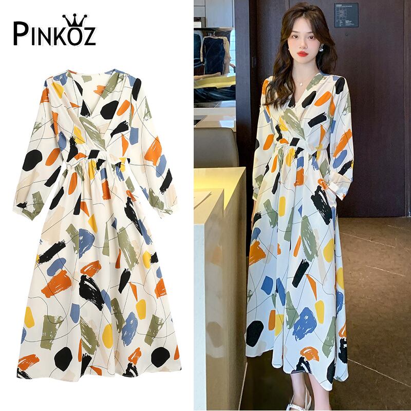 Pinkoz 秋春花柄ジオメトリ パターン ロング ドレス ポケット v ネック ルーズ サイズ女性エレガント自由奔放に生きる新しい ファッション ドレス vestido ピンク スプリング 春物 オータム 秋物 Vネック