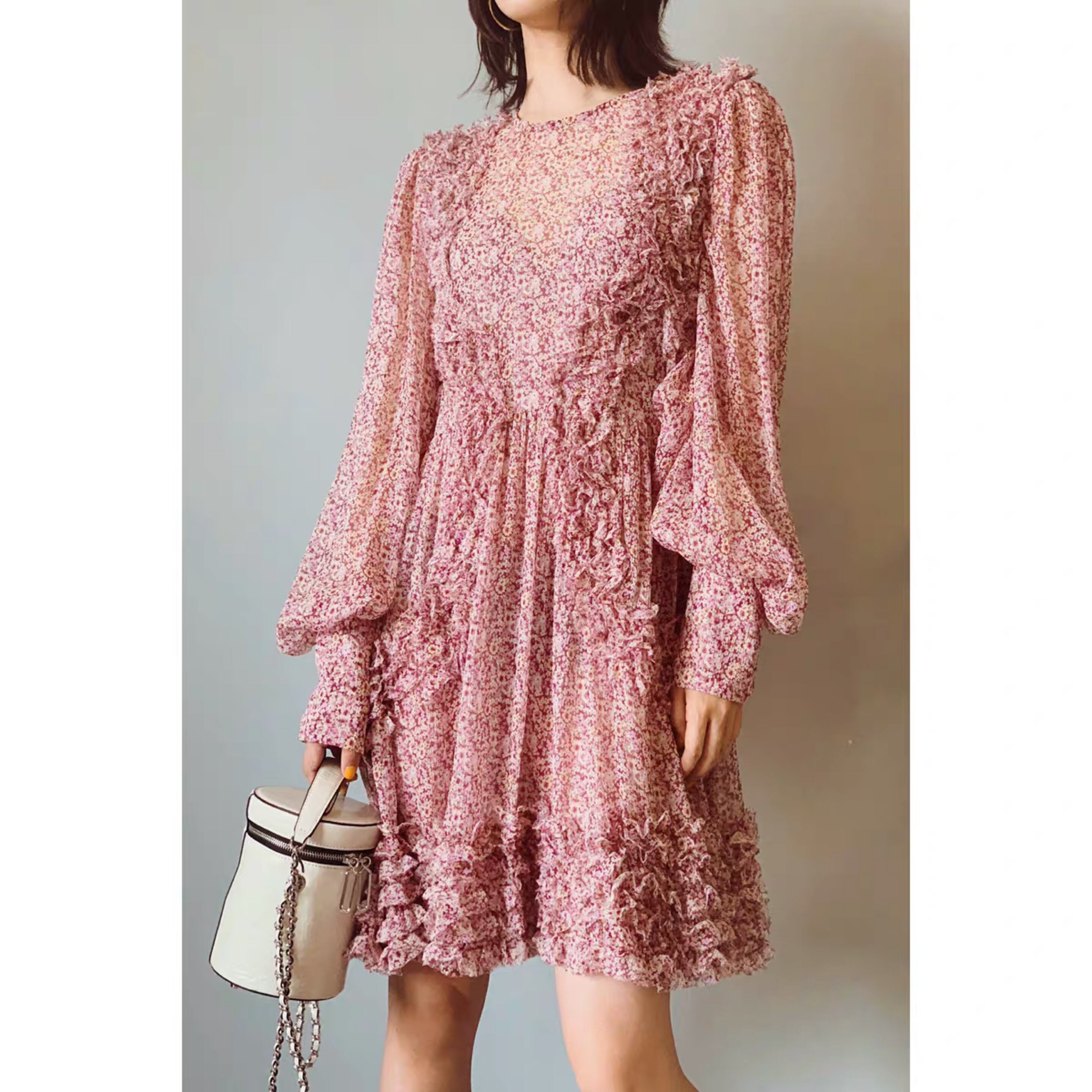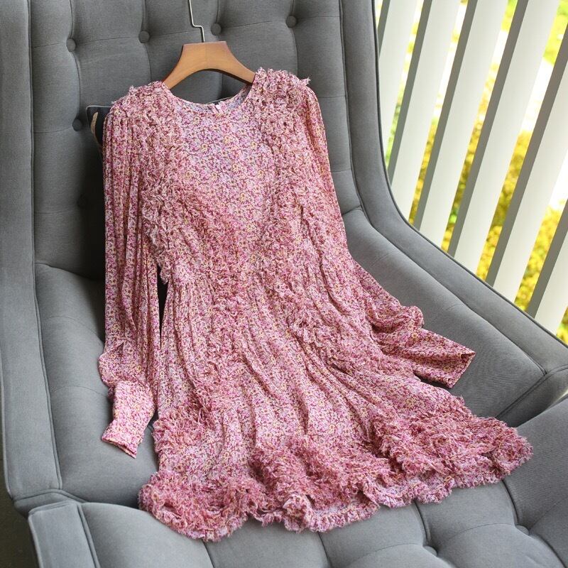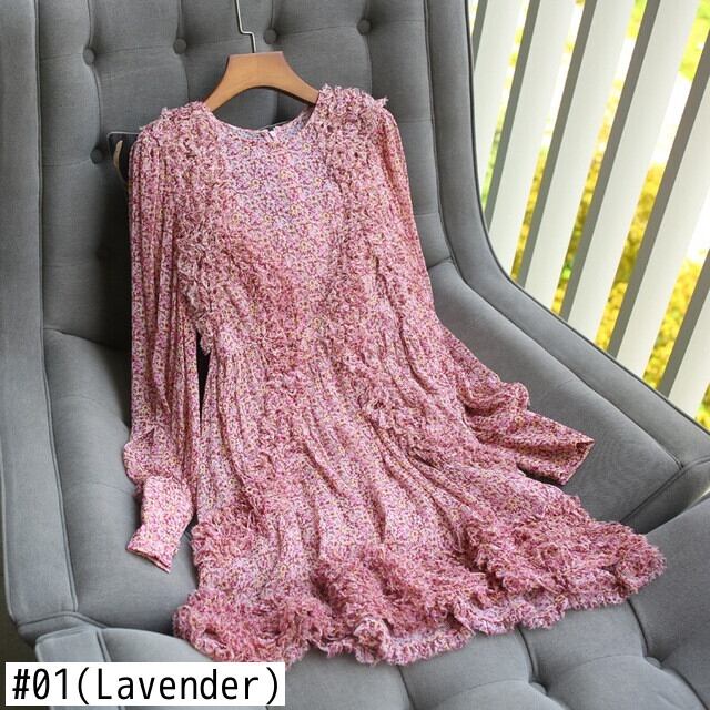 Pinkoz オータム スター ショー O ネック ボヘミアン フローラル ドレス ビーチ フリル プリント ミニドレス パーティードレス ピンク 秋物 花柄 Oネック シルク