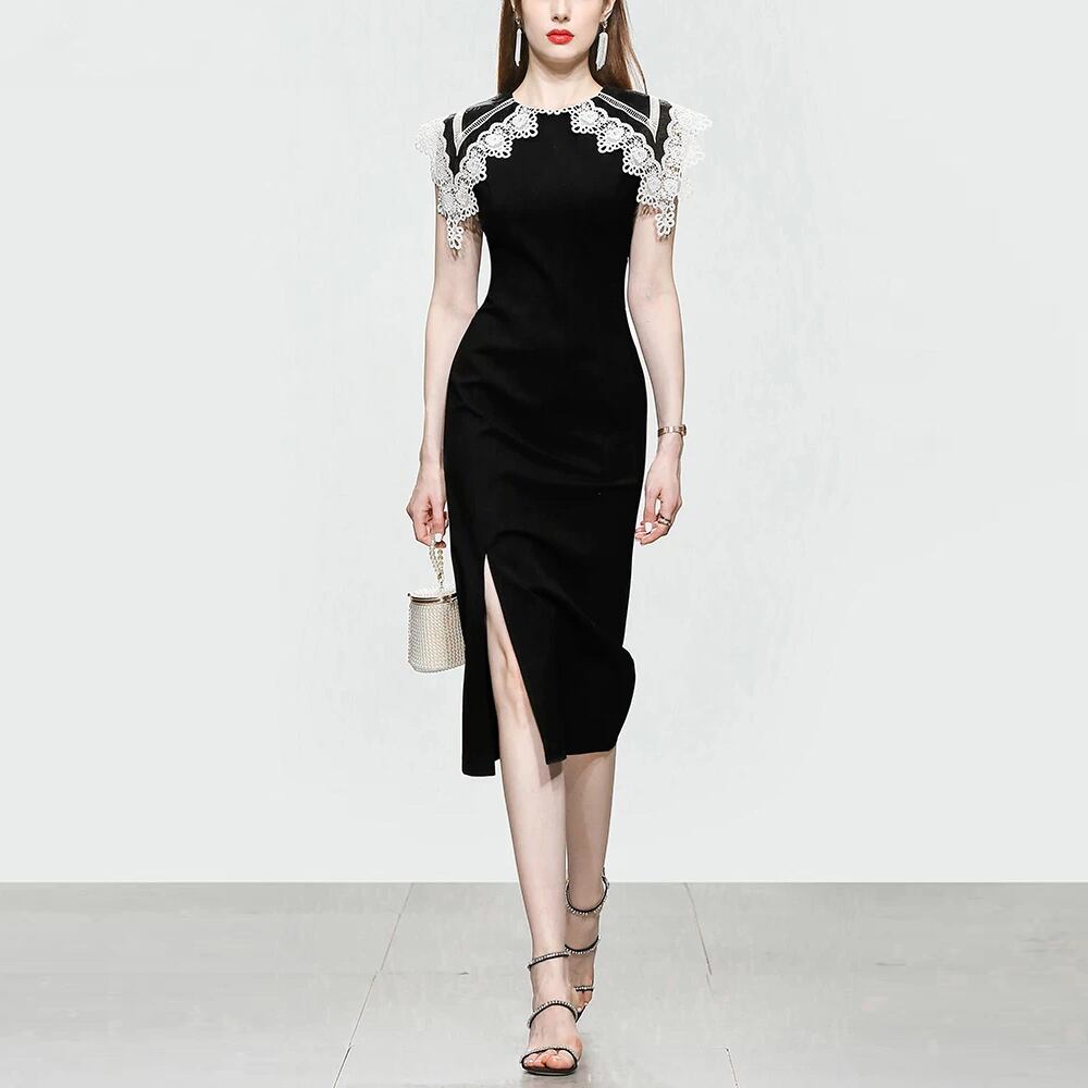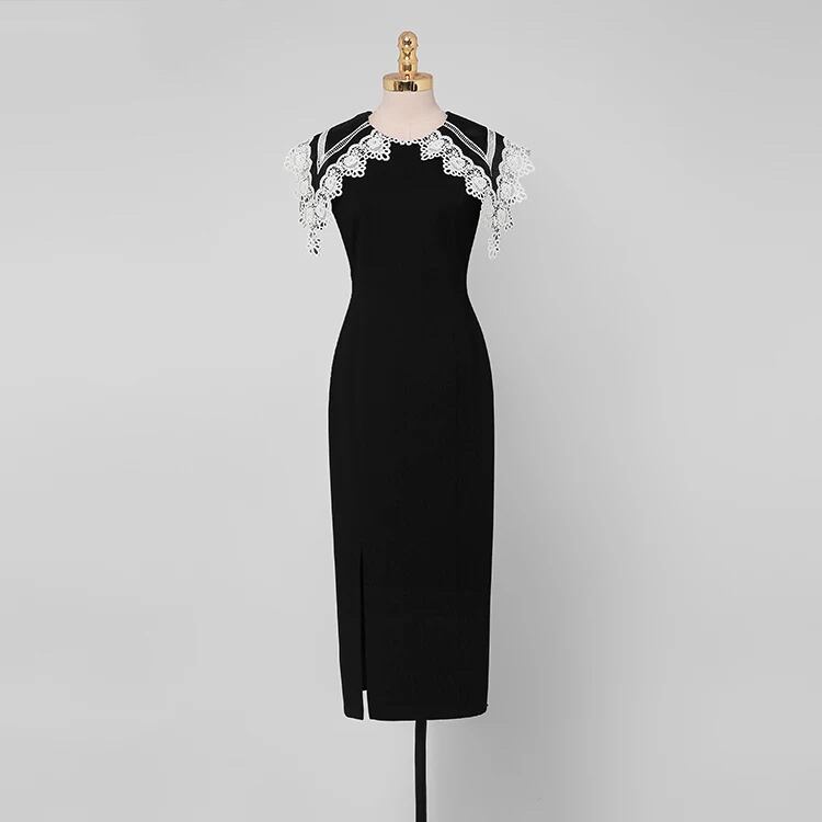 Pinkoz エレガント ヴィンテージ フレンチ ミディ ドレス ブラック ピーターパン カラー ストレート オフィス レディー 作業服 レース パッチワーク ドレス mujer ピンク ビンテージ 会社 学校 通勤や通学にも