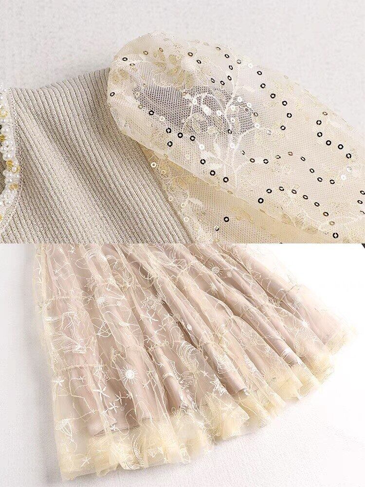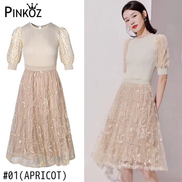 Pinkoz 2 点セット女性ドレス セット アプリコット ニット トップス ランタン スリーブ スリム プルオーバー + ビーズ スパンコール スカート レディ エレガント ピンク ランタンスリーブ