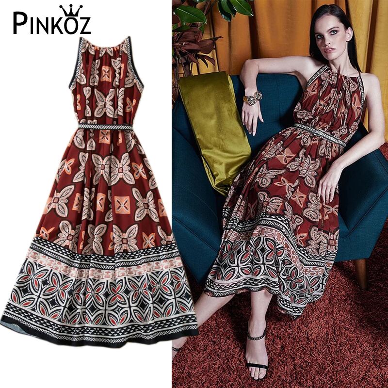 Pinkoz ヴィンテージホルターネックミディドレスボーエン花柄シフォンドレス fo 女性の夏の休日のシックなローブデ mujer vestidos ピンク リボン サマー 夏物 ビンテージ