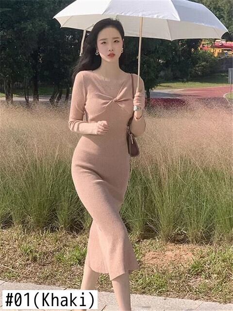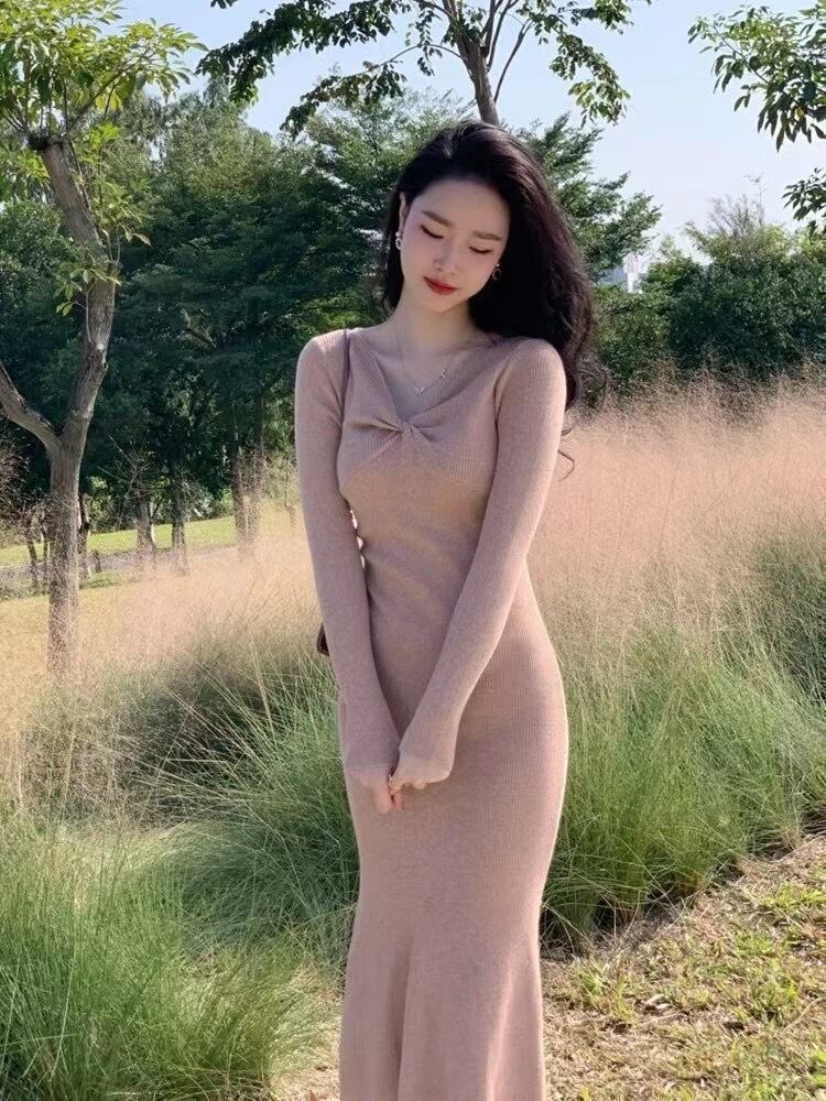 Pinkoz 女性ニットミディドレスバイオレット固体 sweetlove 襟春秋ドレス倍ぬるぬるボディコンマーメイドロングドレスローブ ピンク 大人ガーリー スウィート キュート カジュアル スプリング 春物 オータム 秋物 ソリッドカラー