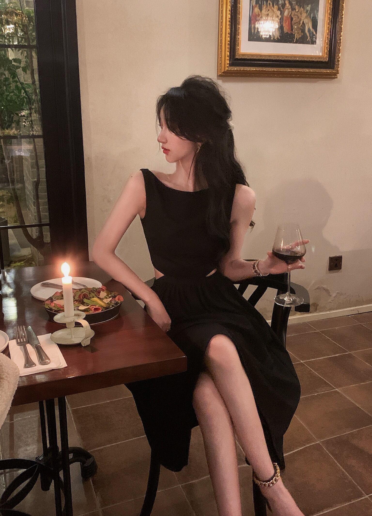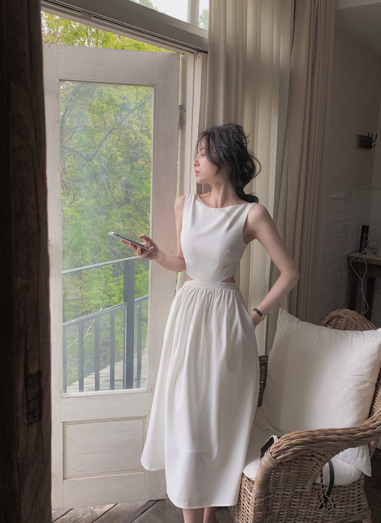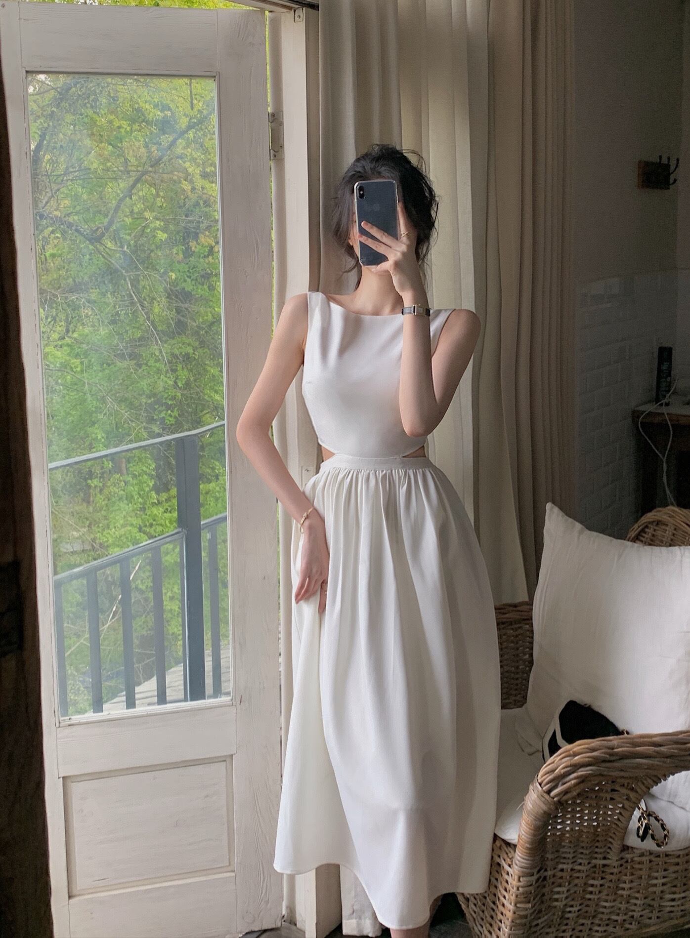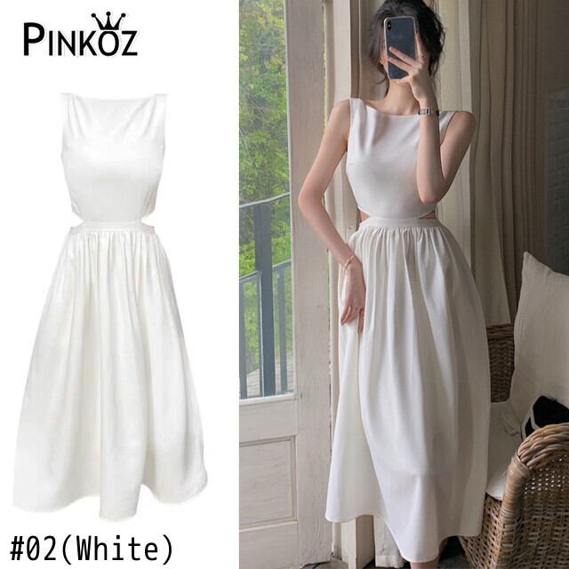 Pinkoz 女性白中空アウト ミディ ドレス o ネック ノースリーブ タンク a ライン ホリデー ドレス ファッション衣類シックなローブ デ mujer traf ピンク ホワイト Oネック Aライン
