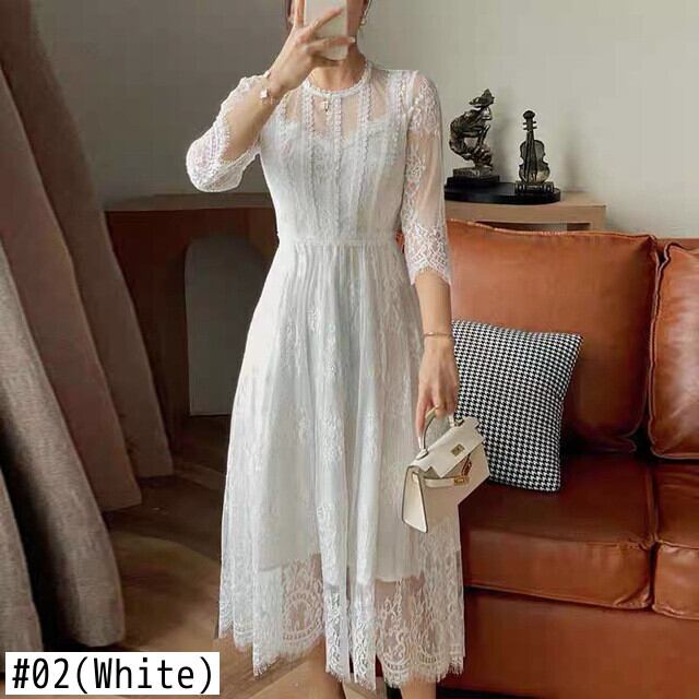 Pinkoz 黒ミディ ドレス エレガントな O ネック レース パッチワーク中空アウト長袖オフィス レディー A ライン パーティー ドレス ビッグ サイズ 2xl ローブ ロング ピンク ブラック Oネック Aライン 会社 学校 通勤や通学にも