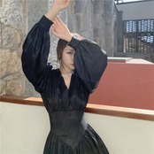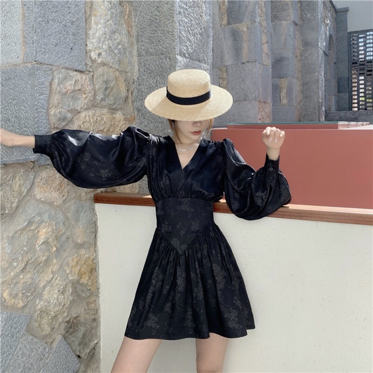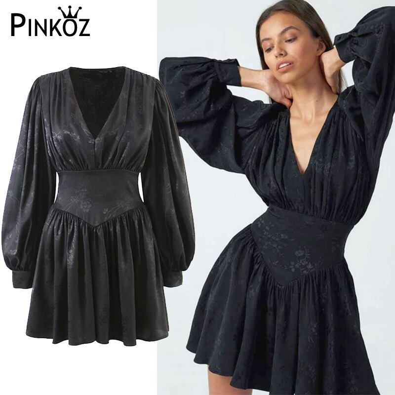 Pinkoz 滑走路デザイナー v ネック ランタン スリーブ女性ミニ ドレス ハイ ウエスト春秋花柄 a ライン パーティー ゴシック ドレス ハイウェスト ピンク ランタンスリーブ スプリング 春物 オータム 秋物 Vネック Aライン