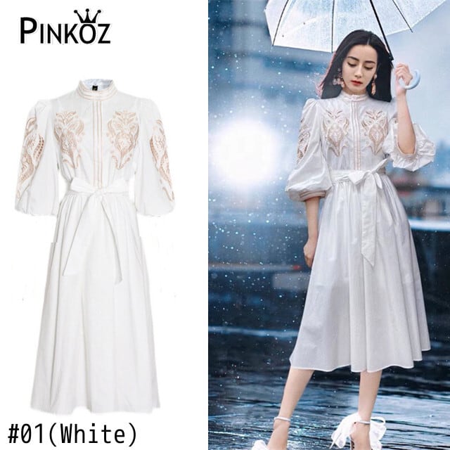 Pinkoz 女性白妖精ミディドレスシングルブレストランタースリーブ中空アウトレースアップエレガントなパーティーナイトディナードレス vestidos ピンク ホワイト
