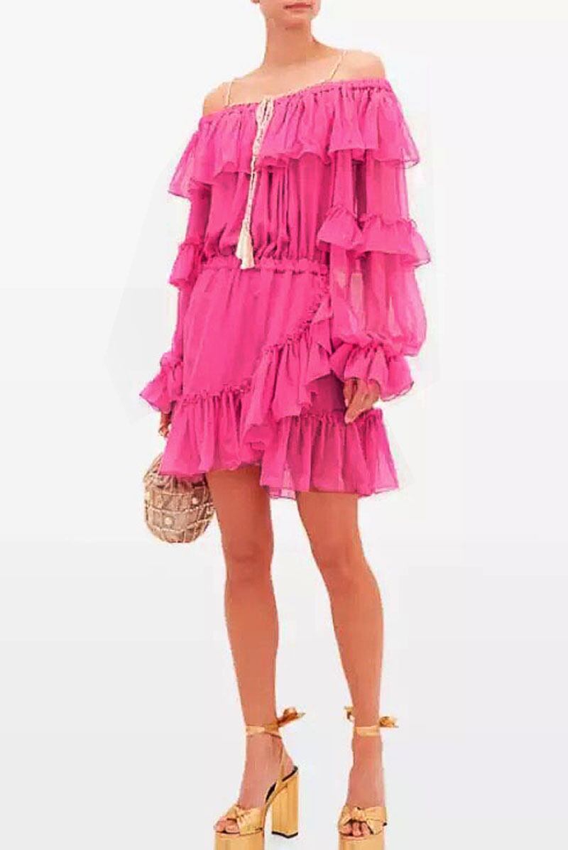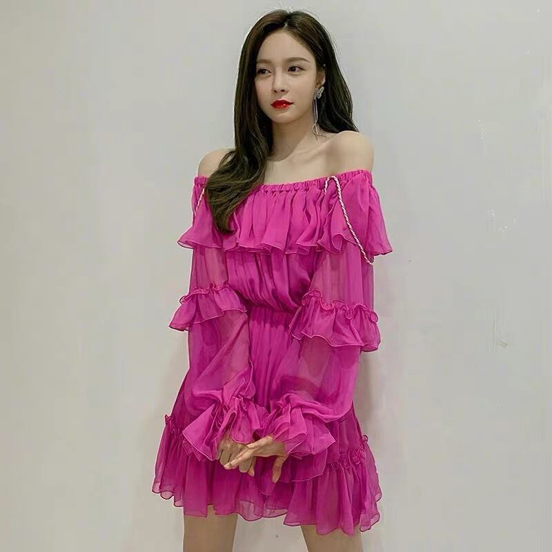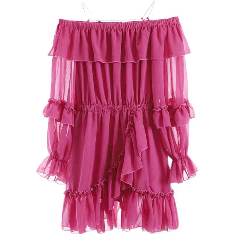 Pinkoz セレブ スタイリッシュ パープル フリル ミニドレス 非対称 長袖 スラッシュネック レースアップ パーティー カジュアル シック ドレス mujer ロング ピンク ラッフル