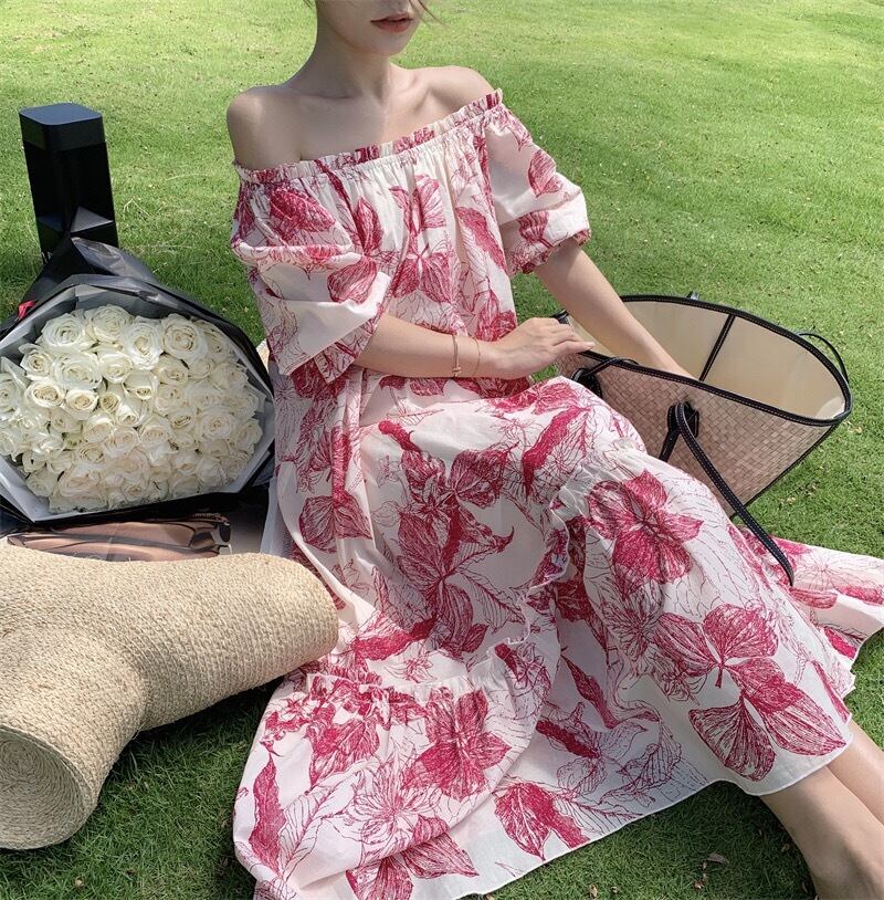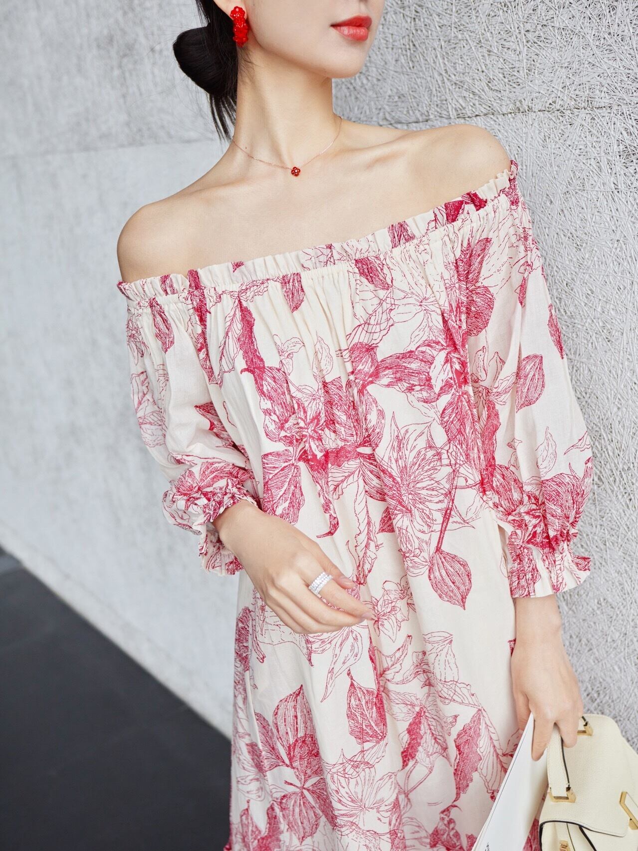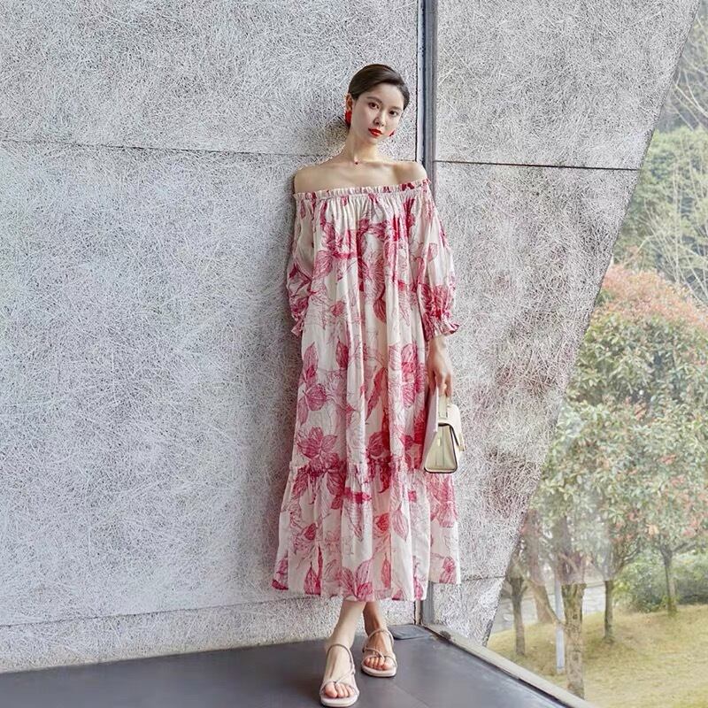 Pinkoz デザイナー スタイリッシュなピンク スラッシュ ネック夏休み自由奔放に生きるミディ ドレス女性パーティー ビーチ シックなローブ デ mujer vestidos traf サマー 夏物