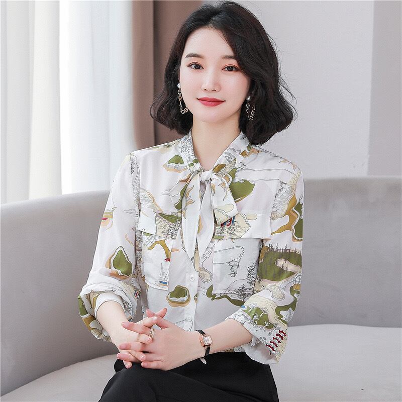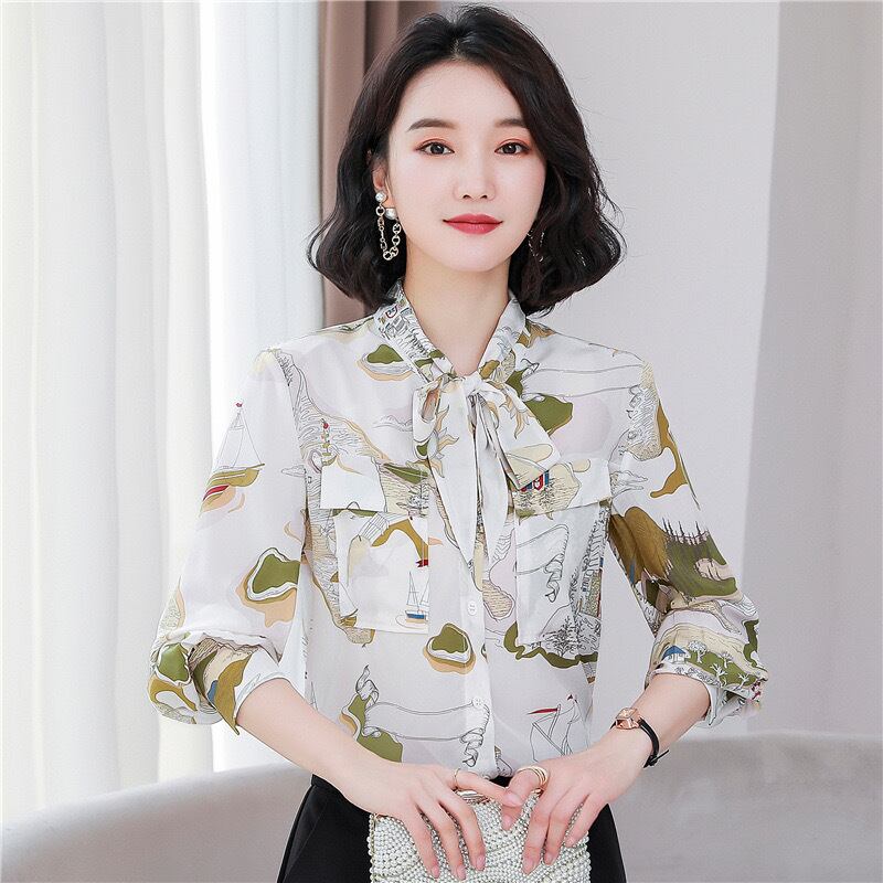 Pinkoz 女性シフォンブラウス弓襟花柄女性長袖プリントシャツ女性トップスポケットトップ za ロング ピンク リボン
