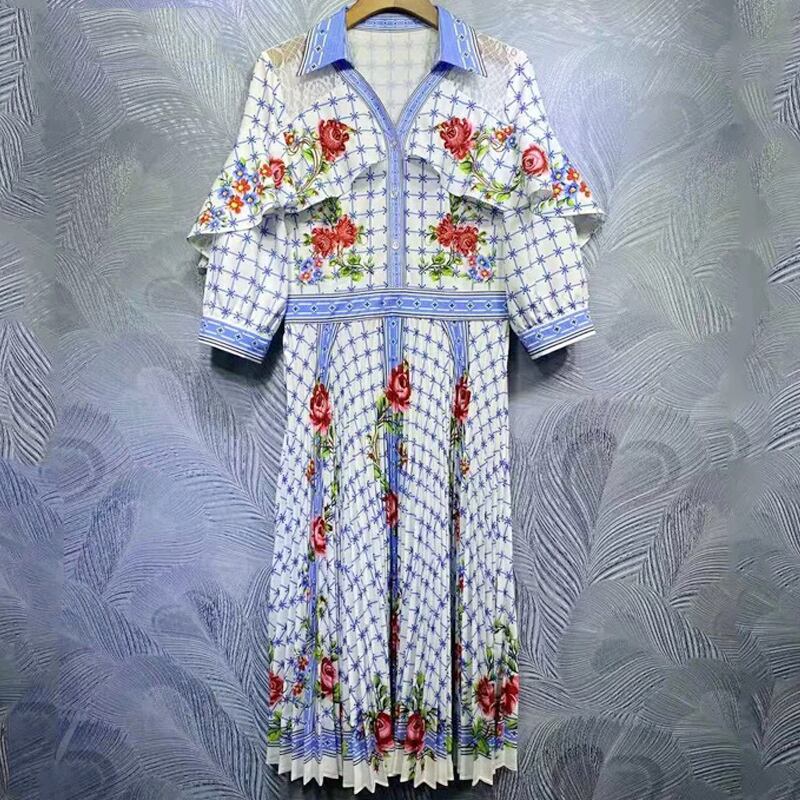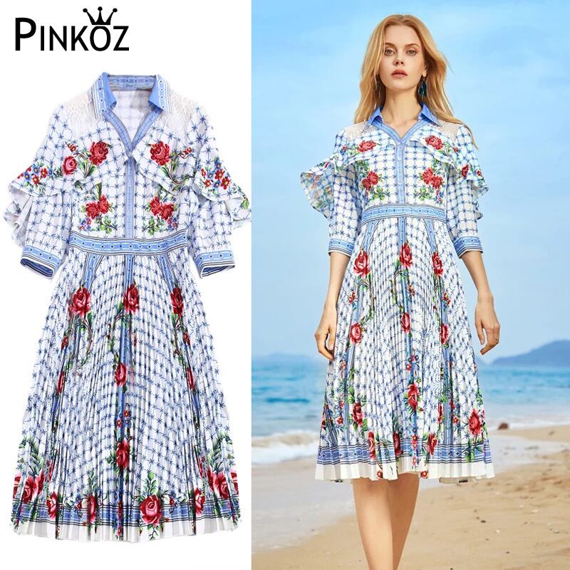 Pinkoz プリーツ ドレス ブルー ホワイト チェック柄 フラワー プリント 夏 春 女性 ランウェイ レース ラグジュアリー ピンク スプリング 春物 サマー 夏物 フラワーデザイン