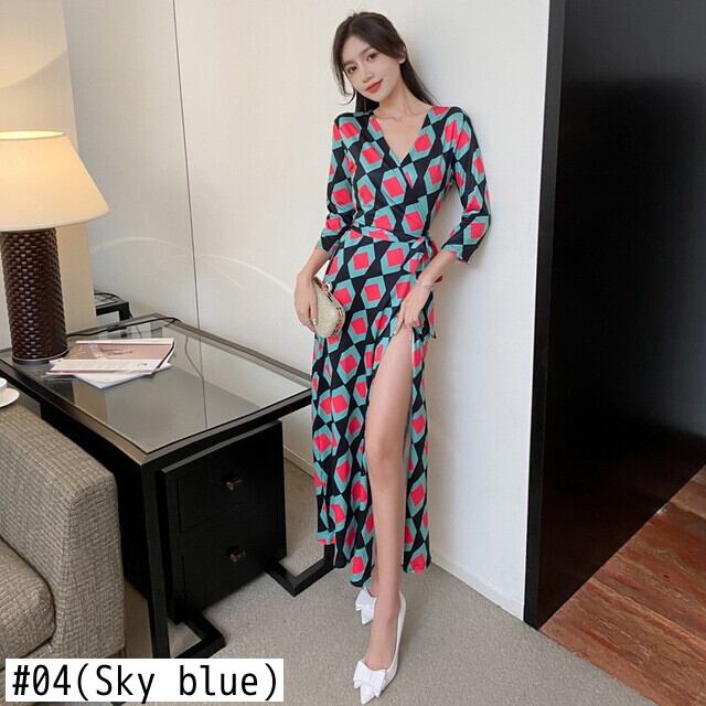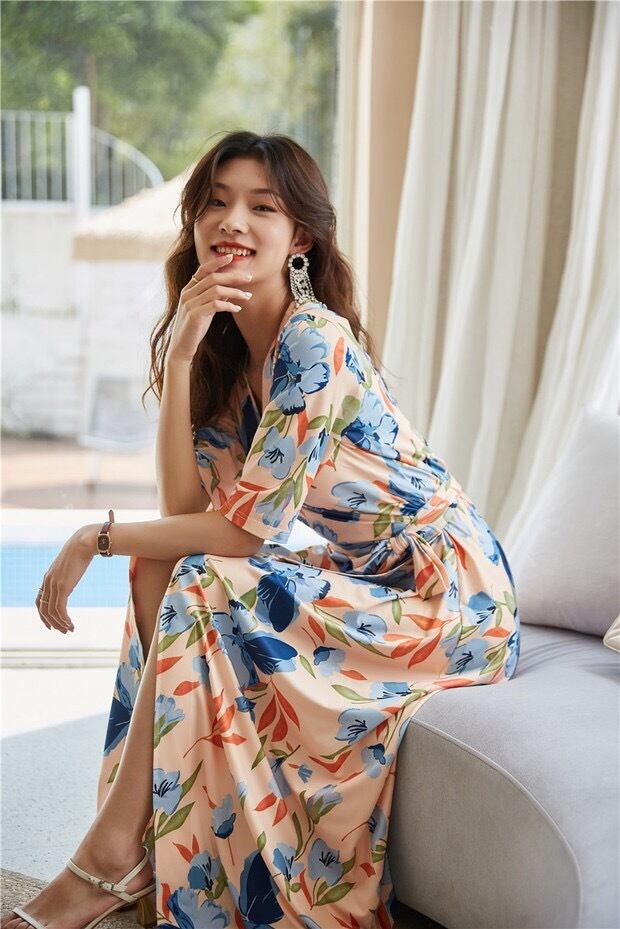 Pinkoz デザイナー レースアップ花プリント休日自由奔放に生きるマキシ ドレス エレガントな v ネック半袖自由奔放に生きるファッション女性服 ピンク ハーフスリーブ Vネック フラワーデザイン
