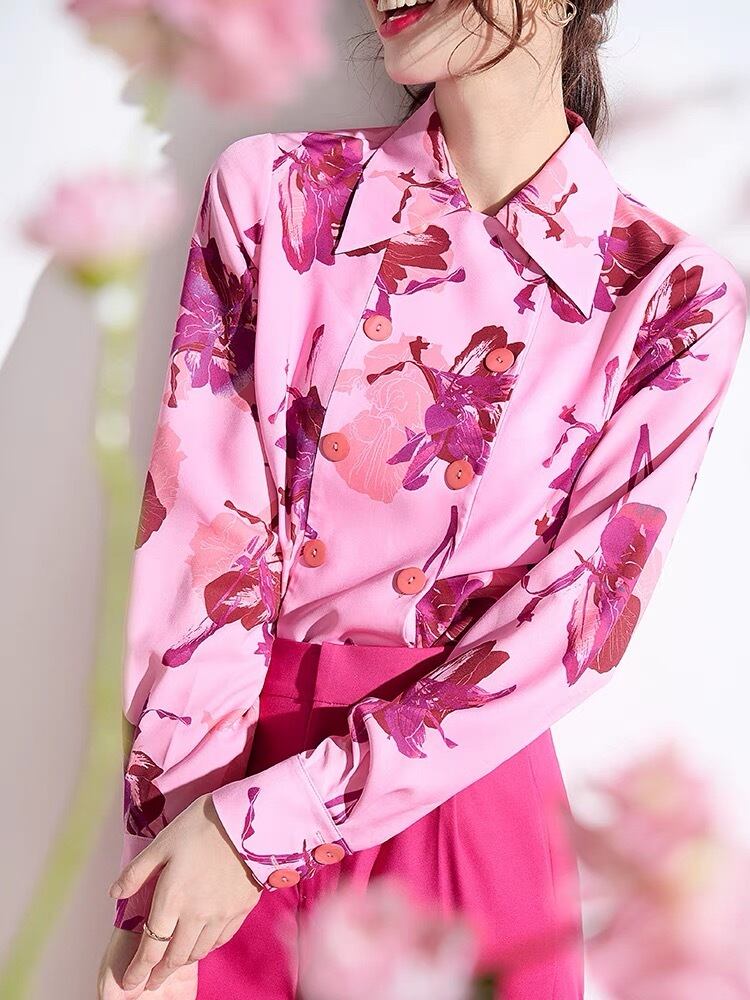 Pinkoz 女性デザイナー赤い花プリント フルスリーブ エレガントなシャツ ファム ダブルブレスト春秋のハイストリート服 traf ピンク レッド スプリング 春物 オータム 秋物 フェミニン フラワーデザイン