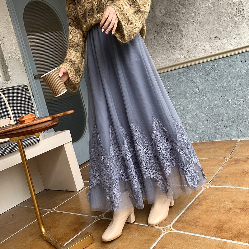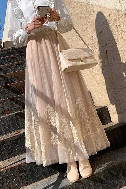 Pinkoz 女性のエレガントなベージュロングスカート刺繍メッシュ妖精ハイウエストマキシエレガントなシックなスカートハイストリート服ヴィンテージ ハイウェスト ピンク ビンテージ