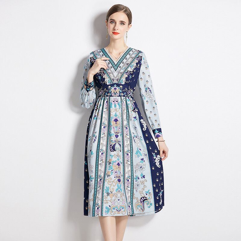 Pinkoz 女性のエレガントな花柄プリント V ネック長袖ミディ ドレス A ライン パッチワーク ファッション ハイストリート服ファム ロング ピンク Vネック Aライン フェミニン