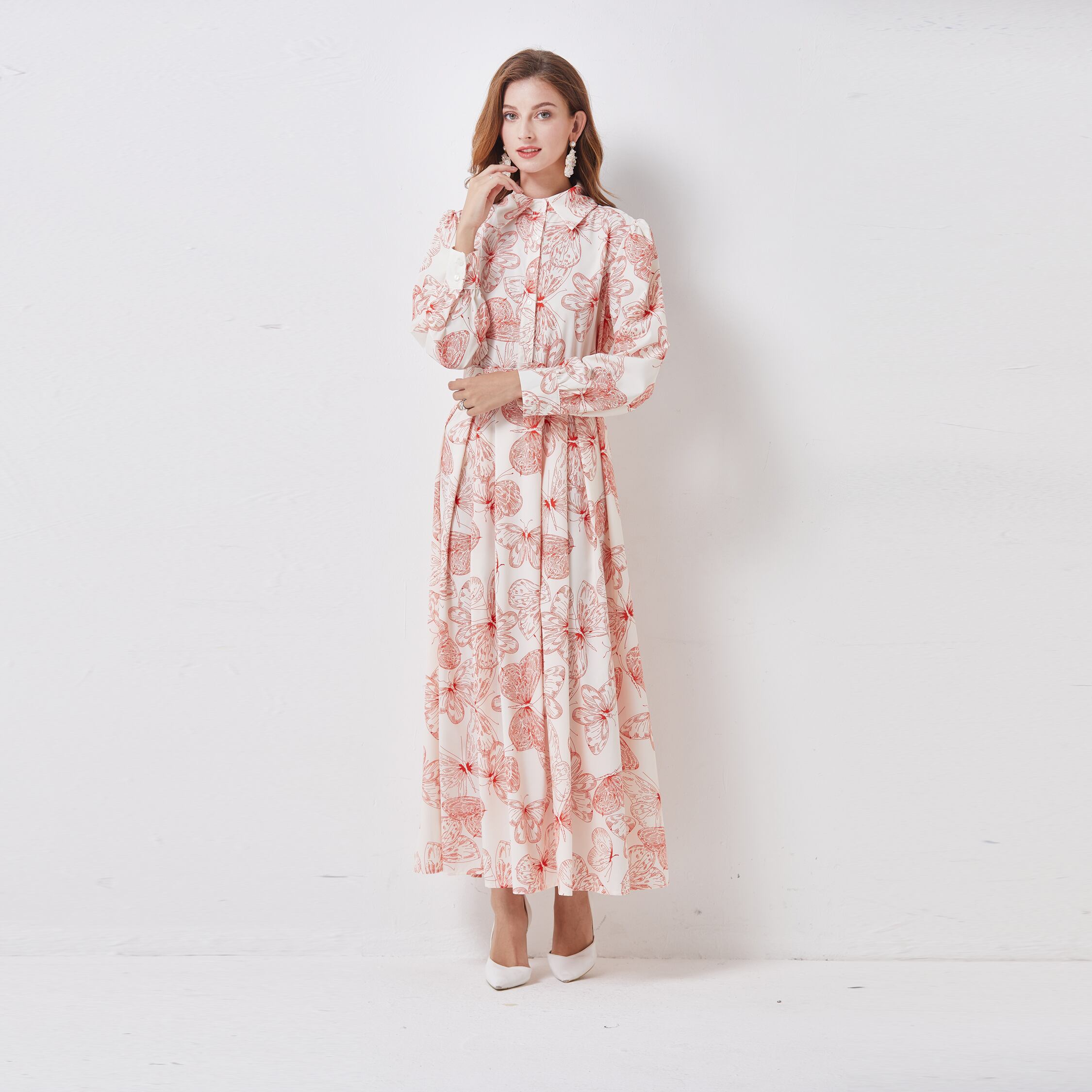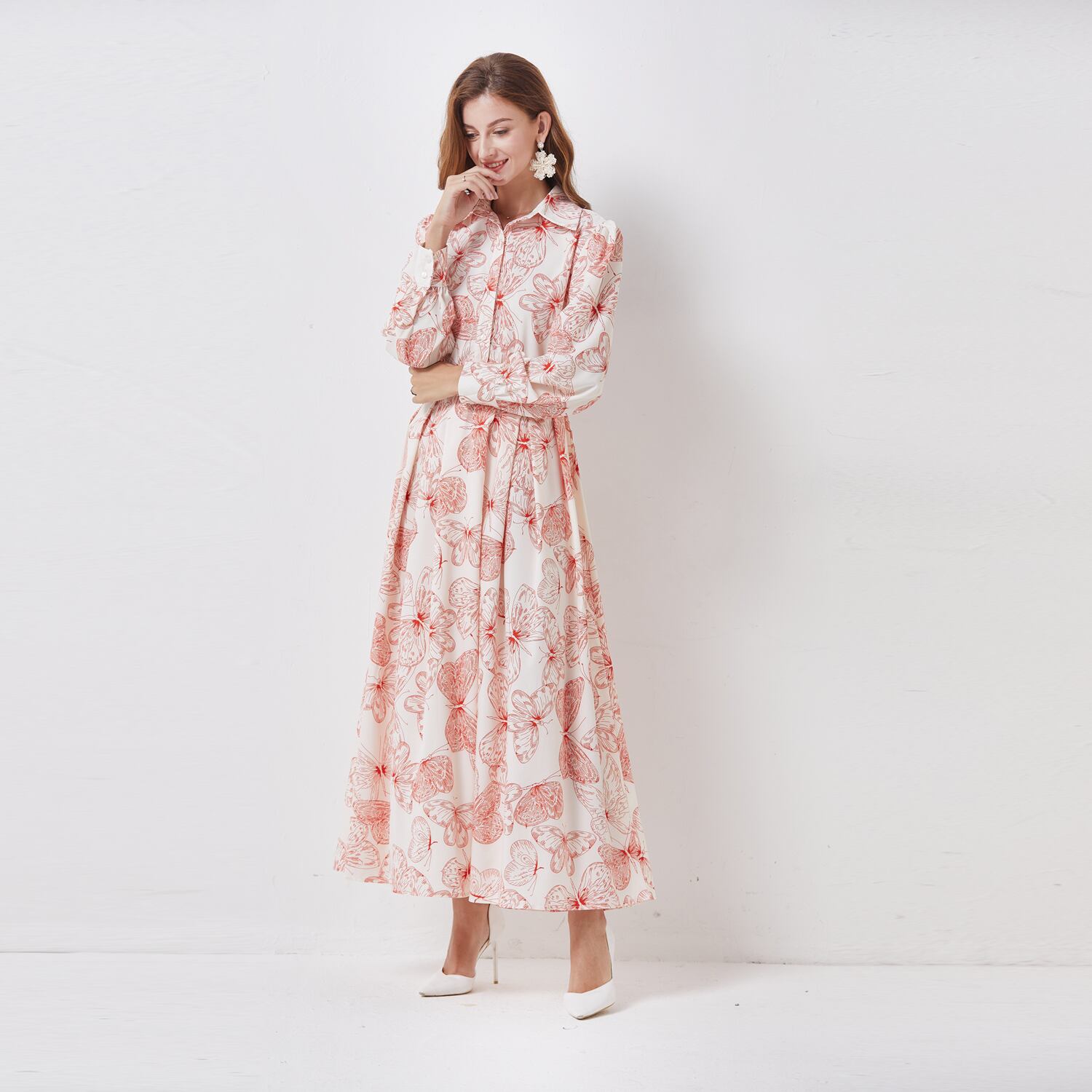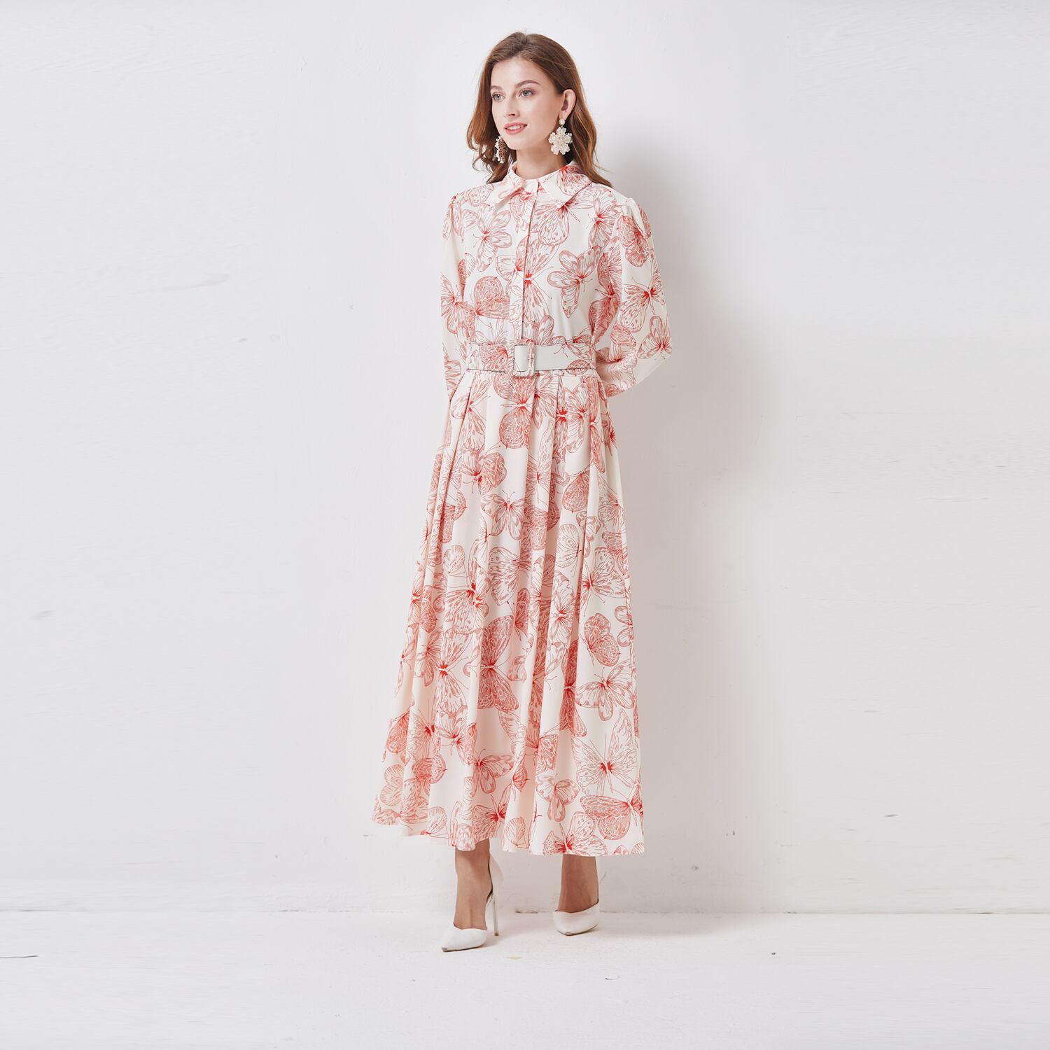 Pinkoz ピンクプリントドレス ロングスカート ベルト付き 秋新作 オータム 秋物 ハーネス