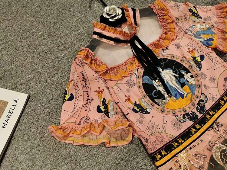 Pinkoz 滑走路デザイナー スタイルのシックなアングル フラワー プリント ミディ ドレス パッチワーク レース シャーリング ボウ ピンク ローブ mujer ドレス リボン フラワーデザイン