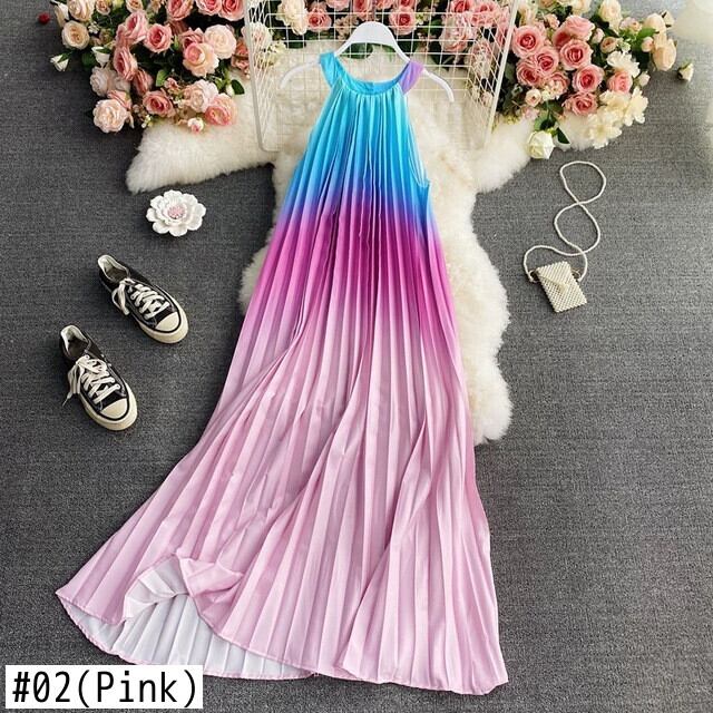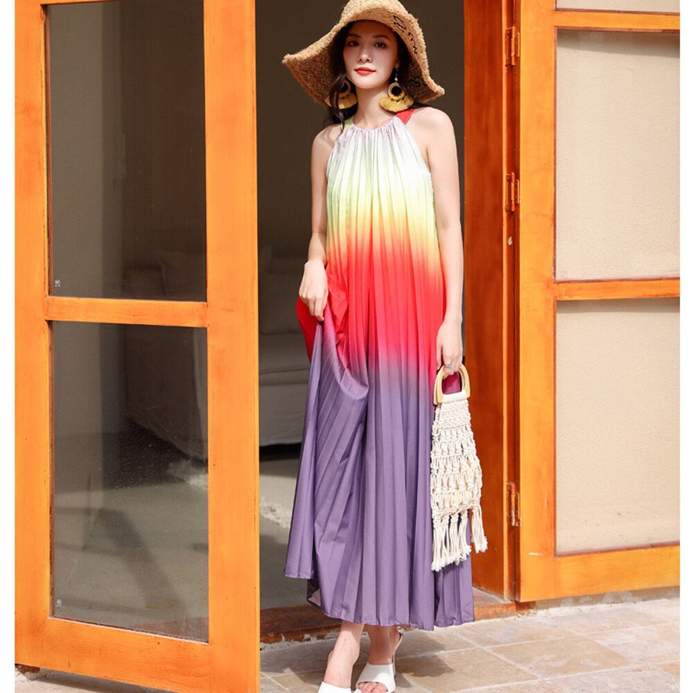 Pinkoz 女性滑走路デザイナー休日グラデーション レインボー プリーツ ホルター マキシ ドレス タンク ビーチ夏カジュアル緩い vestidos traf ピンク サマー 夏物