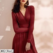 Pinkoz スタイル 痩身 V ネック 長袖 スリット ヘムライン 裾 マル レッド サッシ ミディ パーティー ドレス 春 ロング ピンク スプリング 春物 Vネック