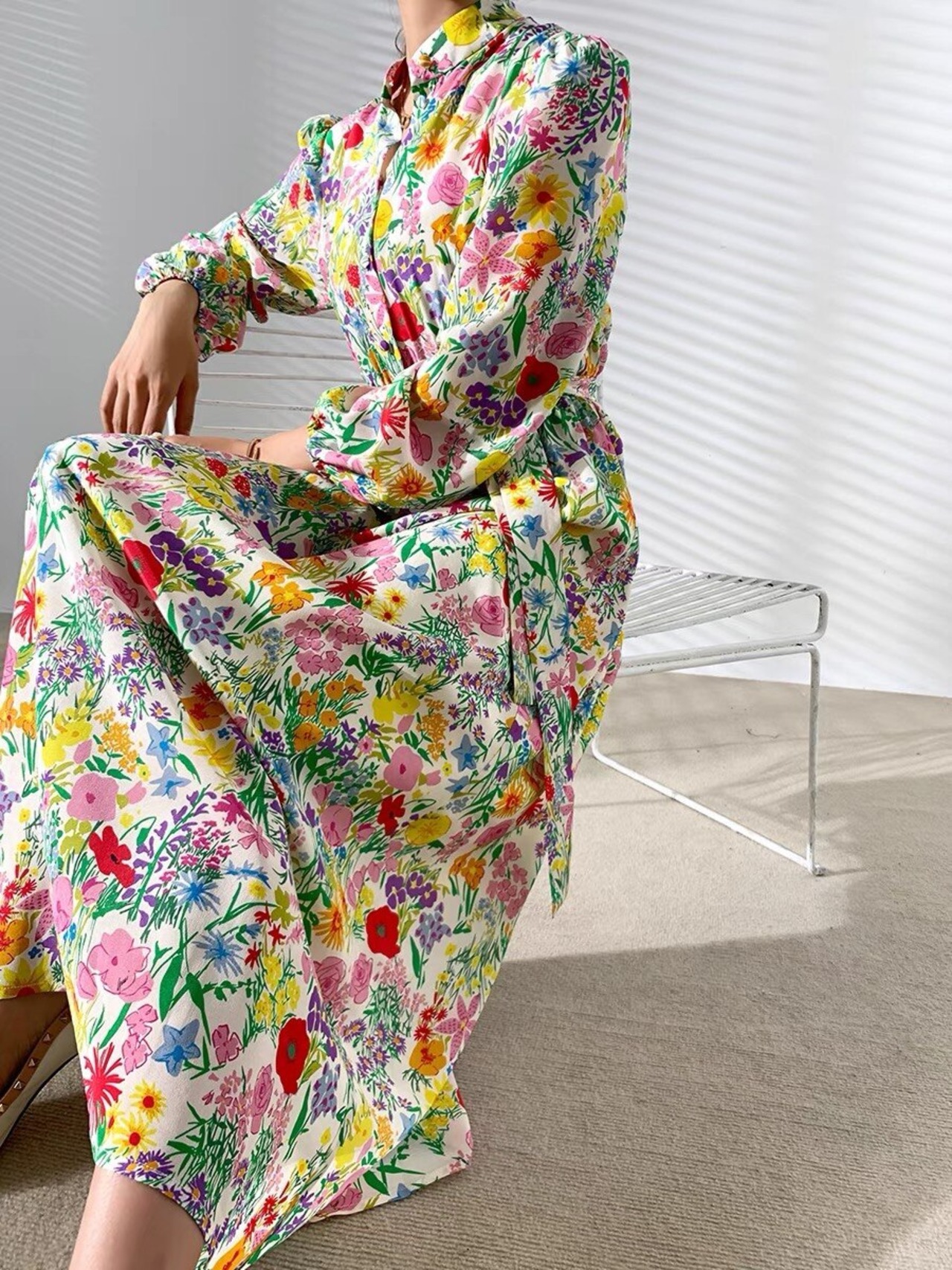 Pinkoz セレブフラワープリントシングルブレストスタンドカラー長袖デザイナーマキシドレス女性女性パーティーカジュアルローブ ロング ピンク フラワーデザイン